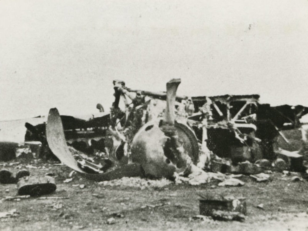 Foto wrak Duitse bommenwerper in weiland. Tekst: "De...