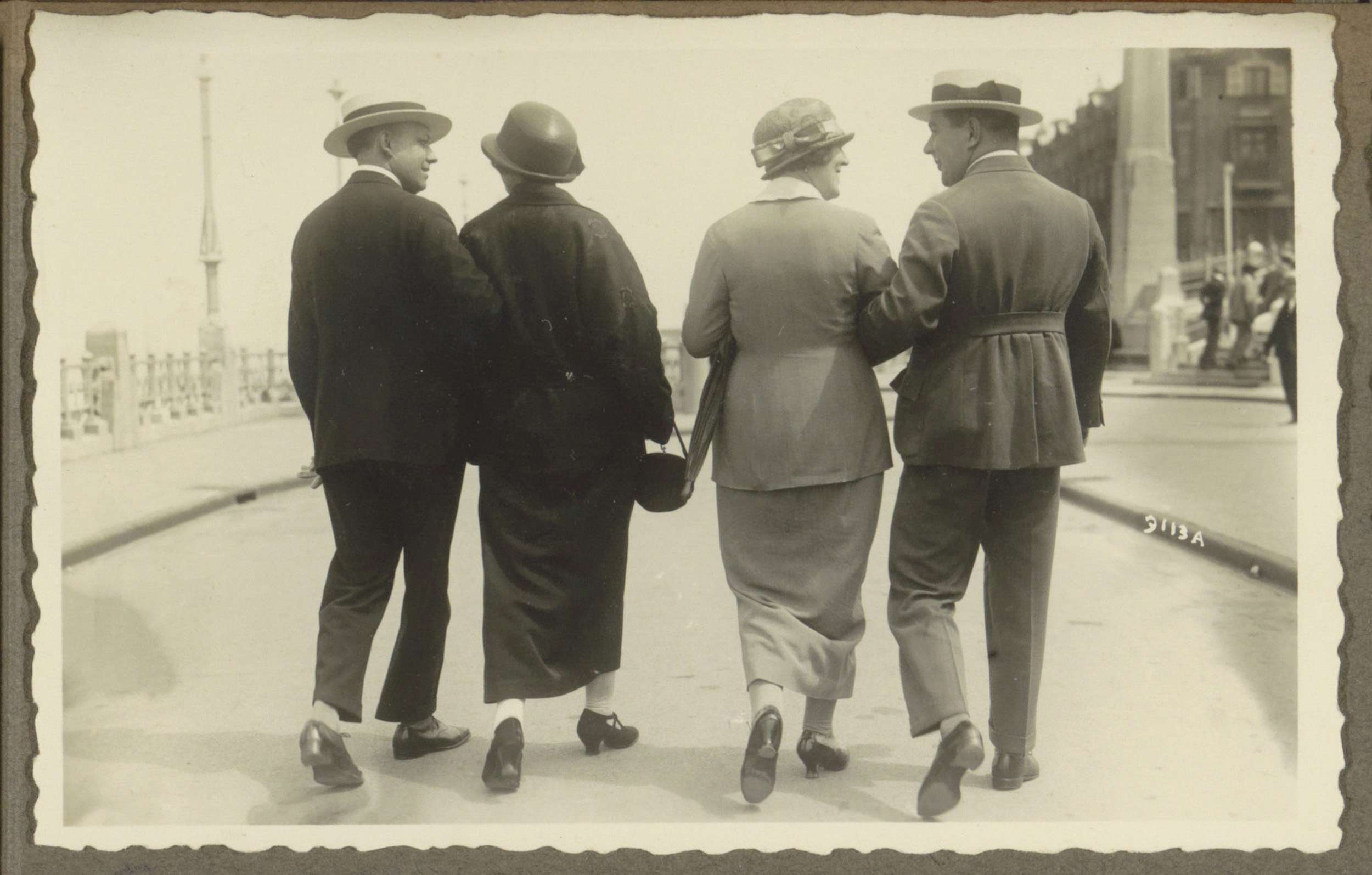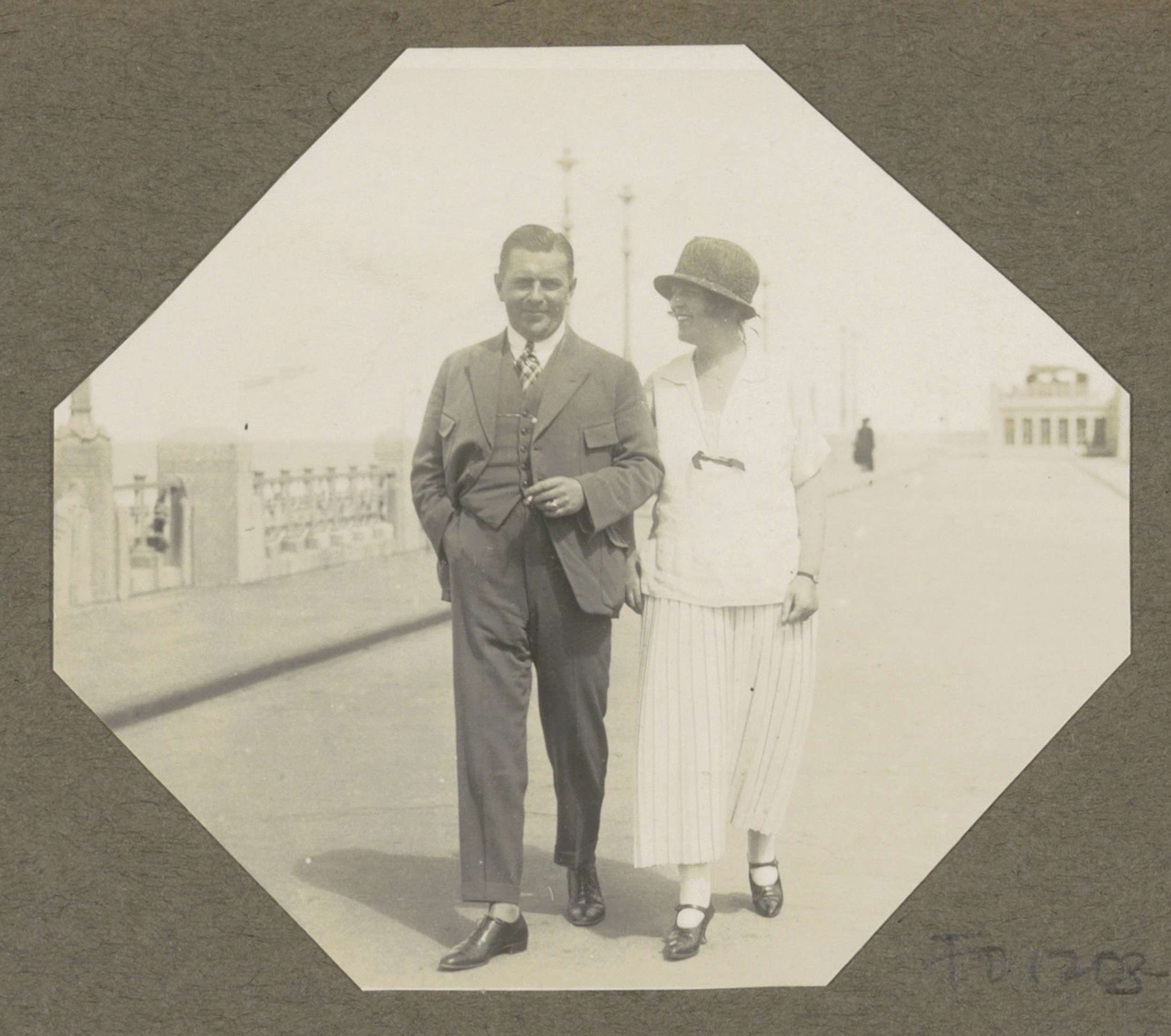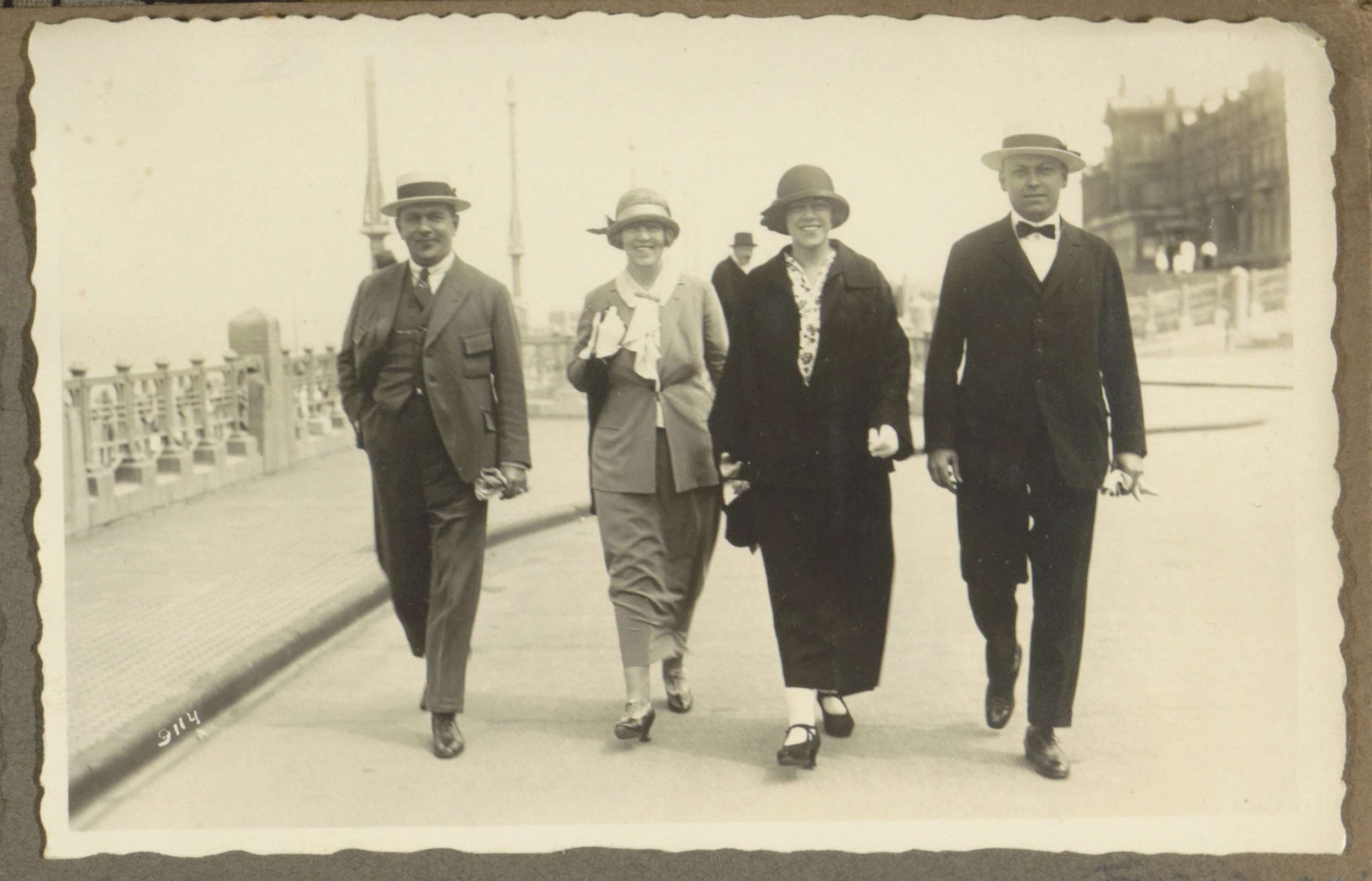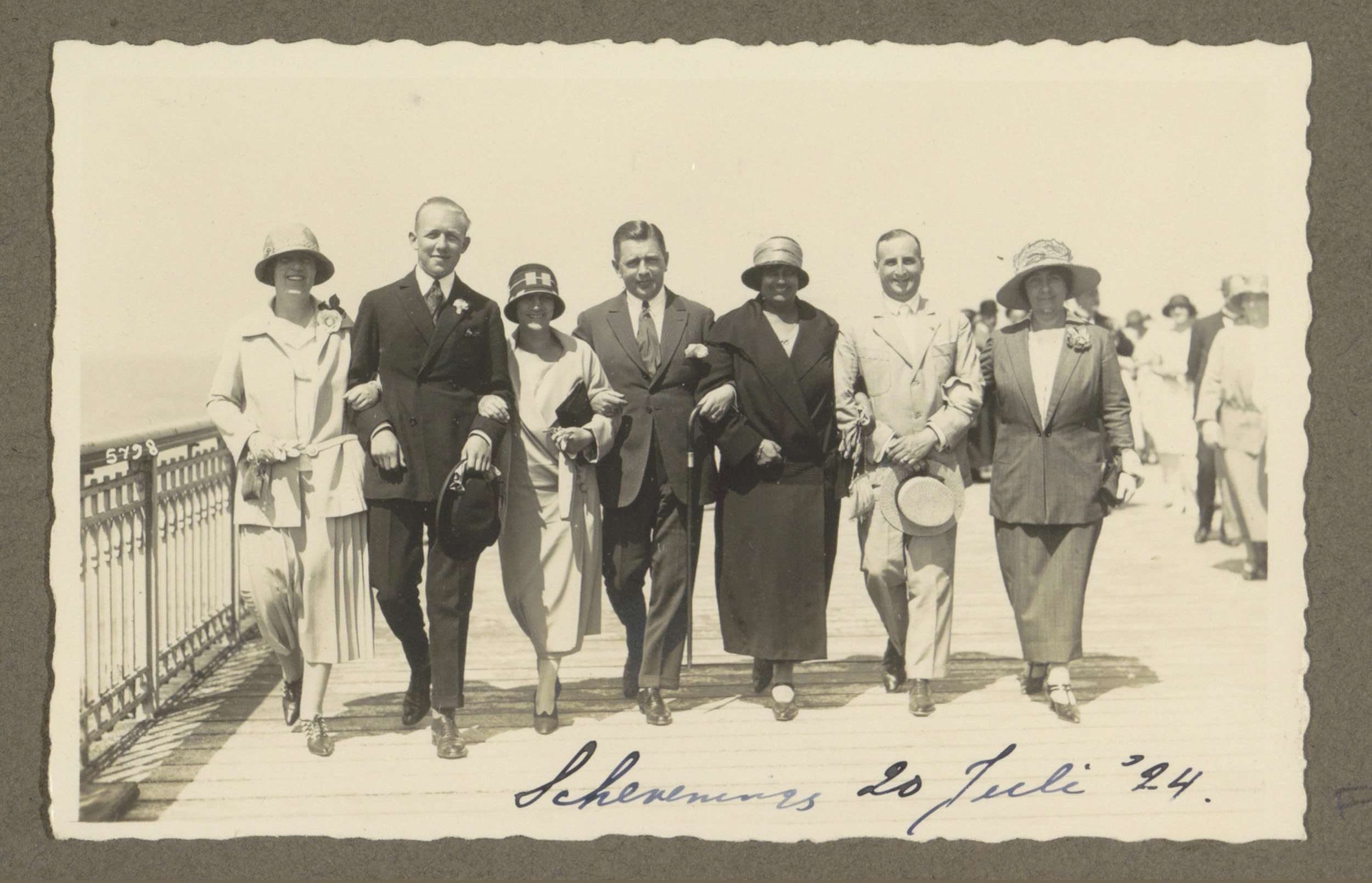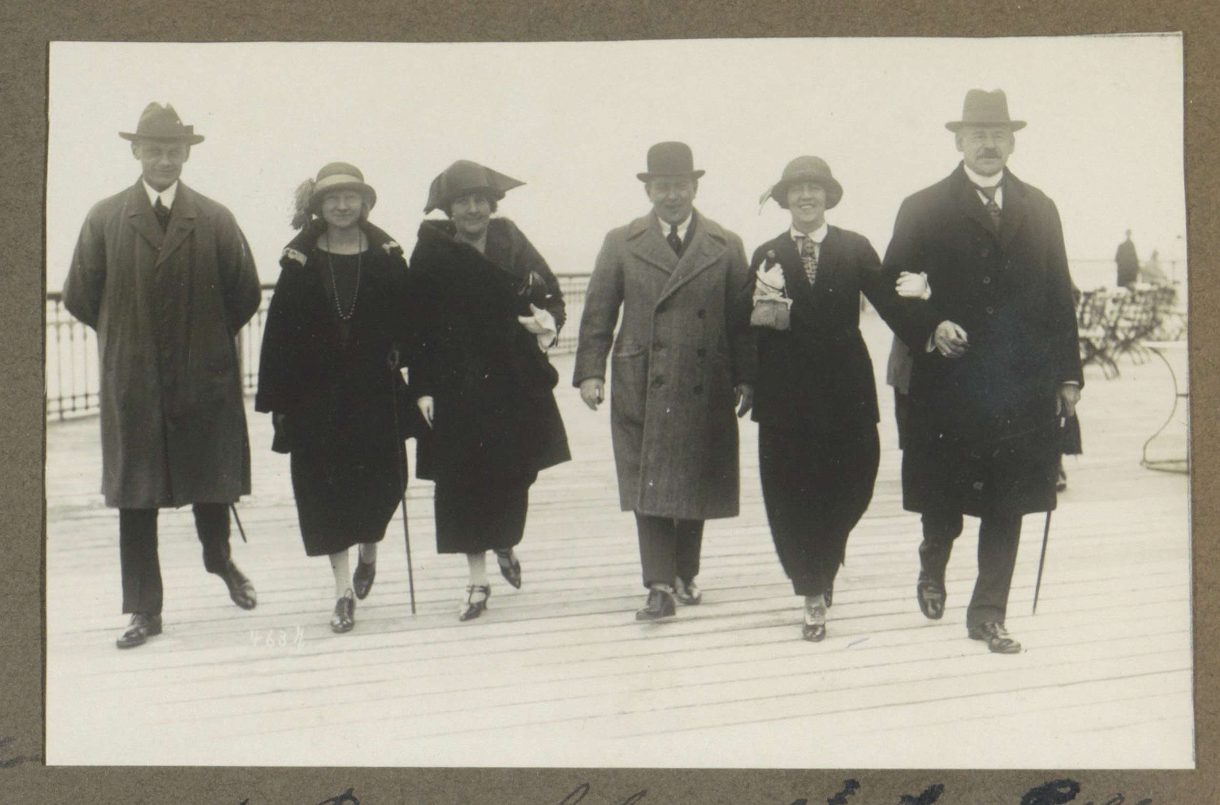 Gezelschap wandelend over (vermoedelijk) de pier van...