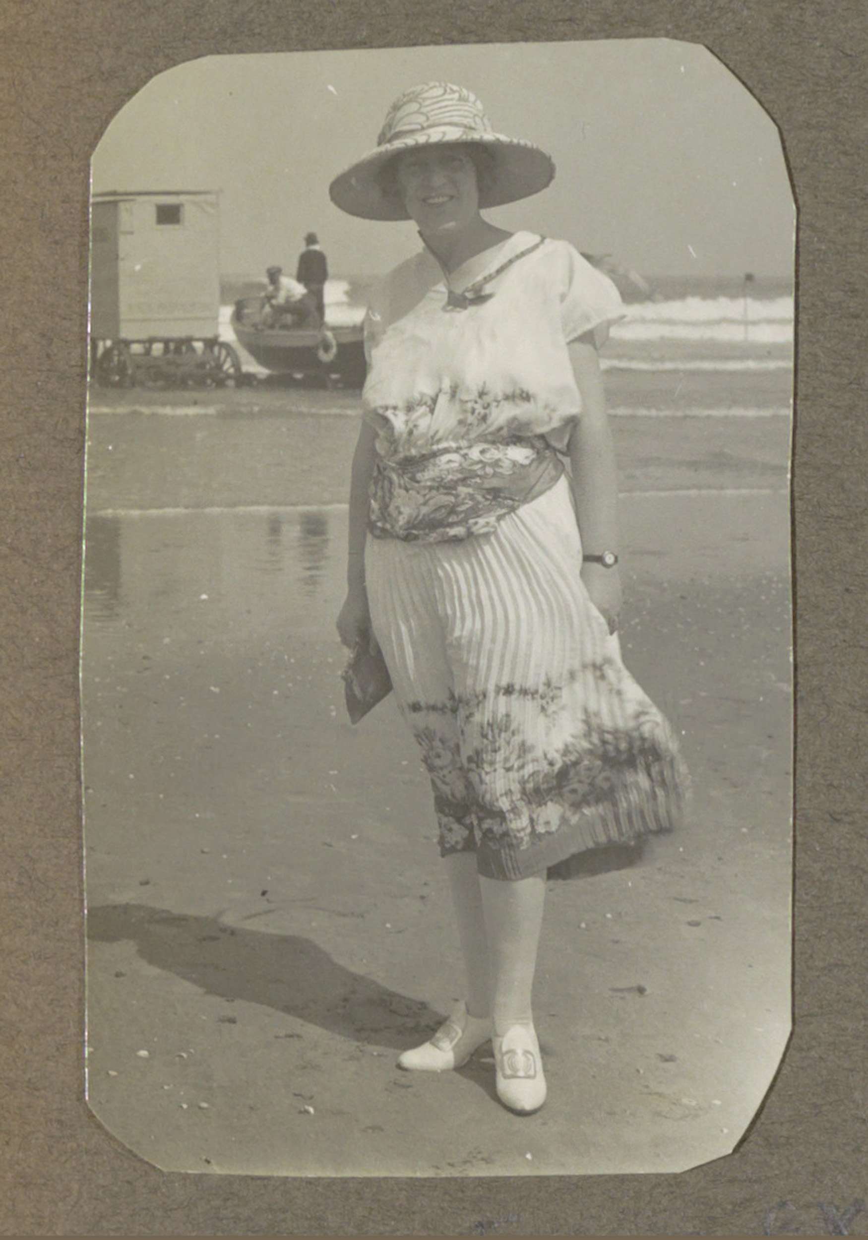 Vrouw met hoed op het strand, vermoedelijk in Nederland