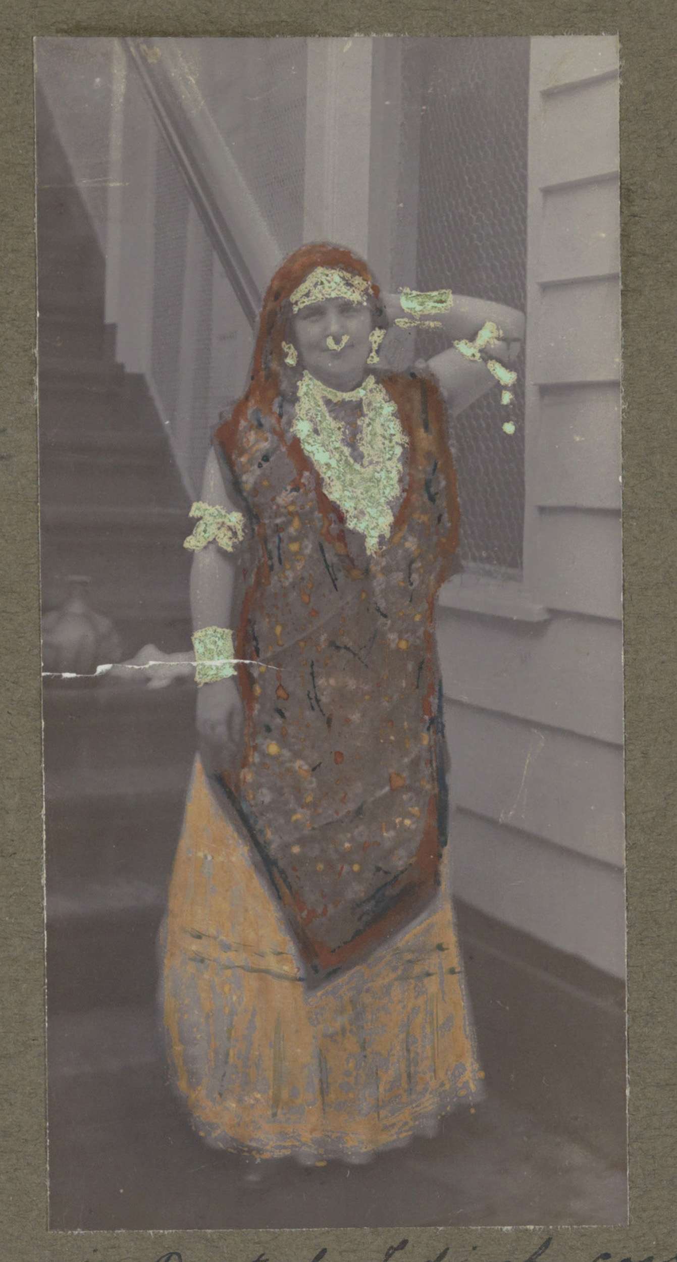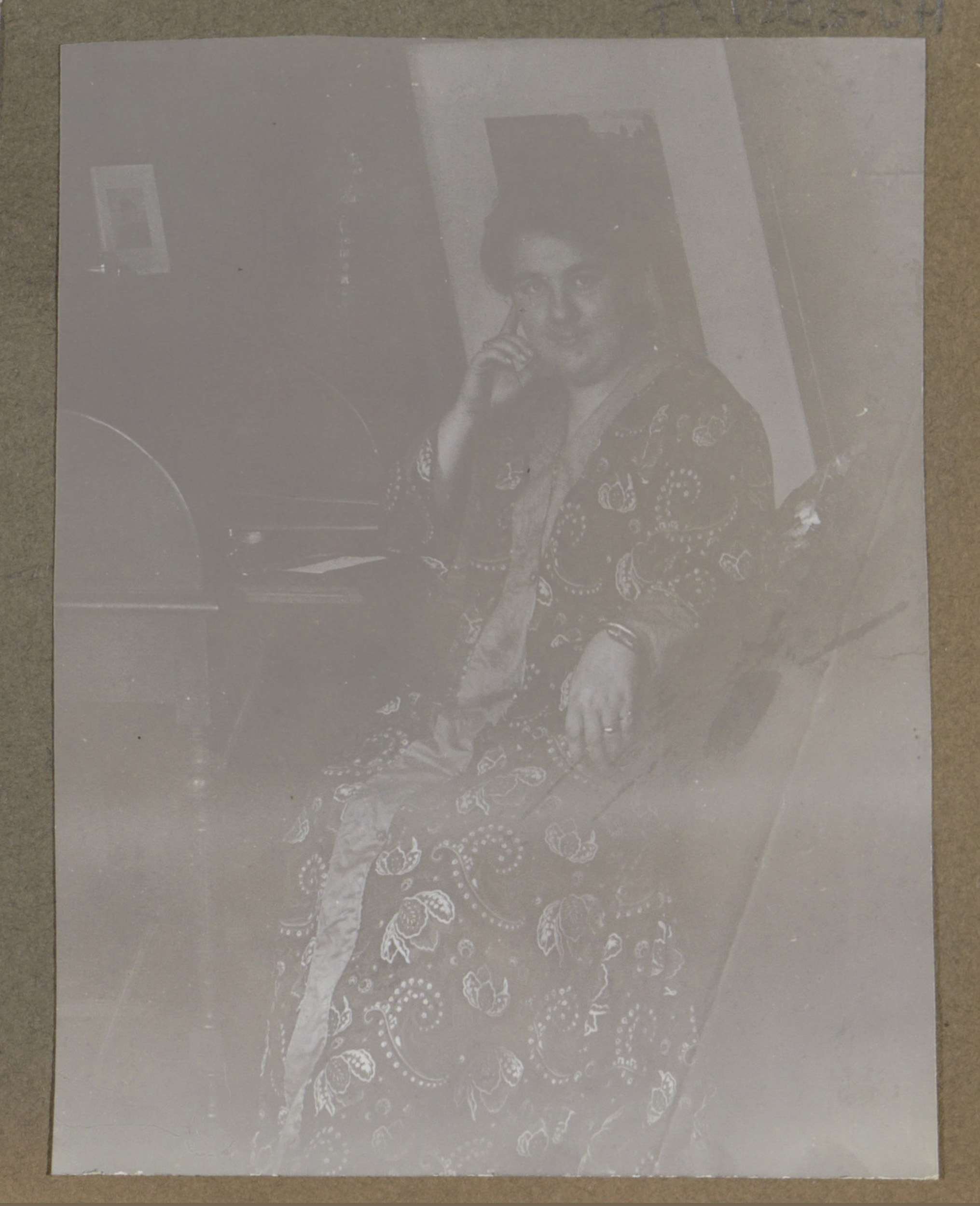 Vrouw zittend bij een piano, mogelijk in Suriname