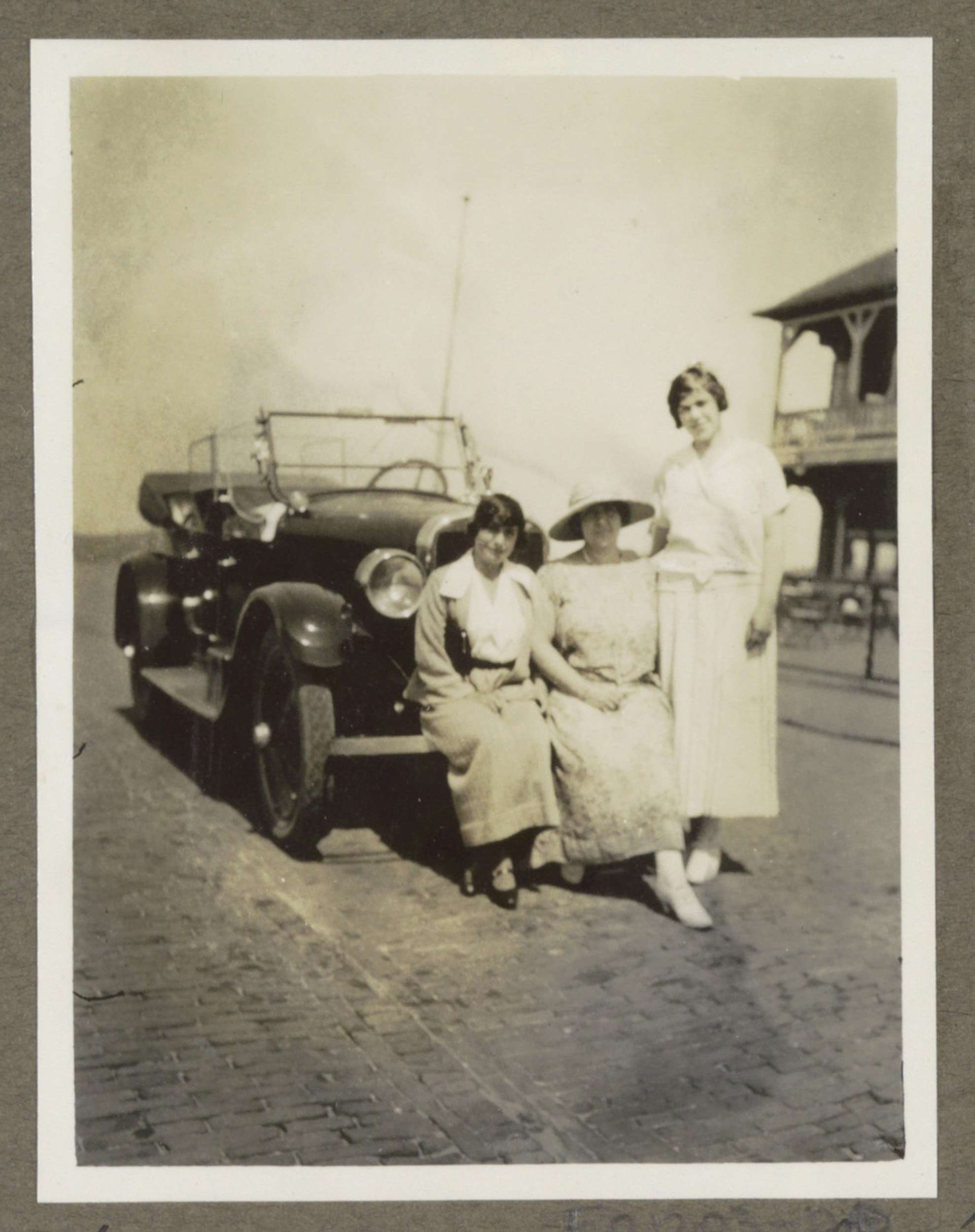 Drie vrouwen poserend bij een auto in Wijk aan Zee