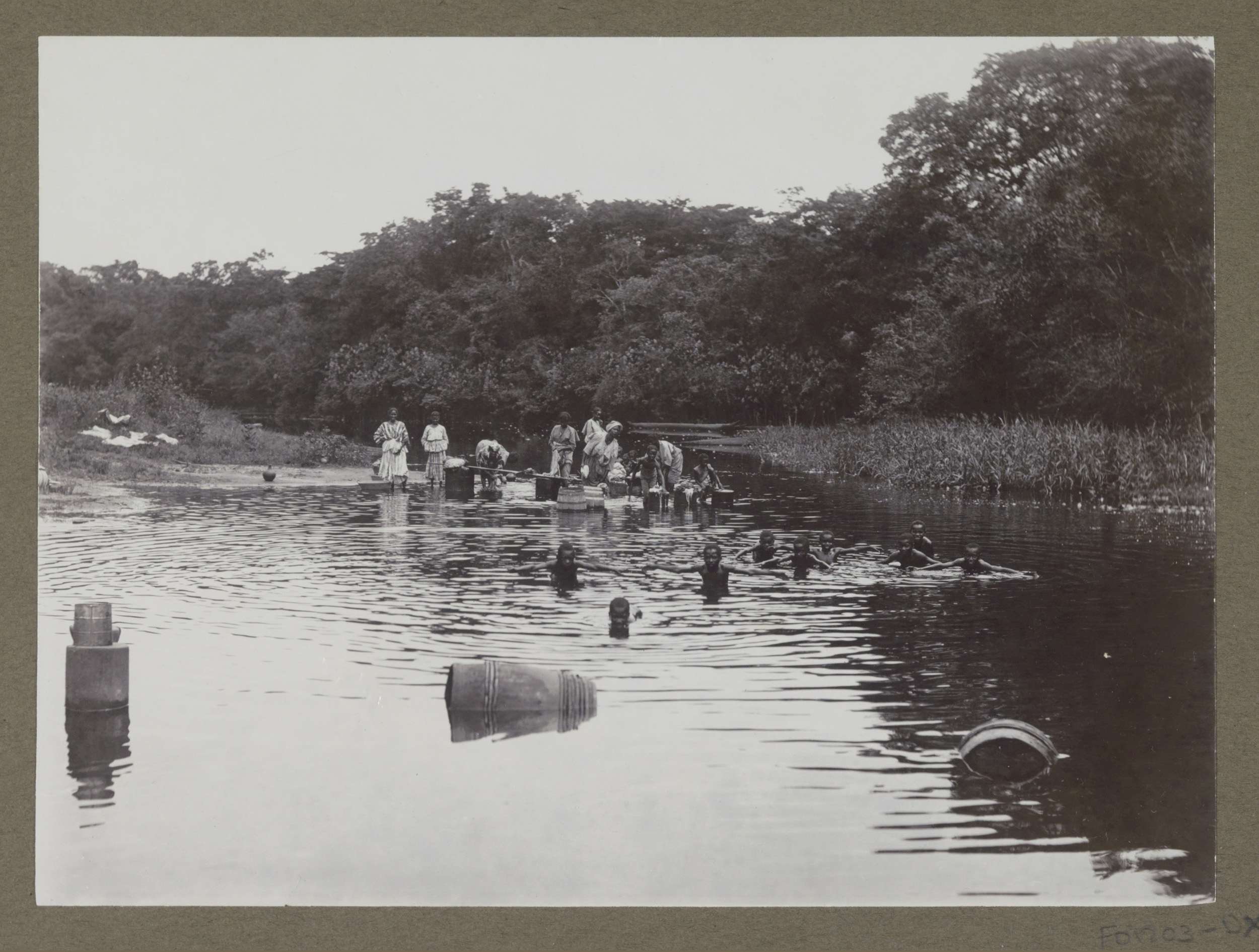 Groep vrouwen en kinderen staand en zwemmend in een ...