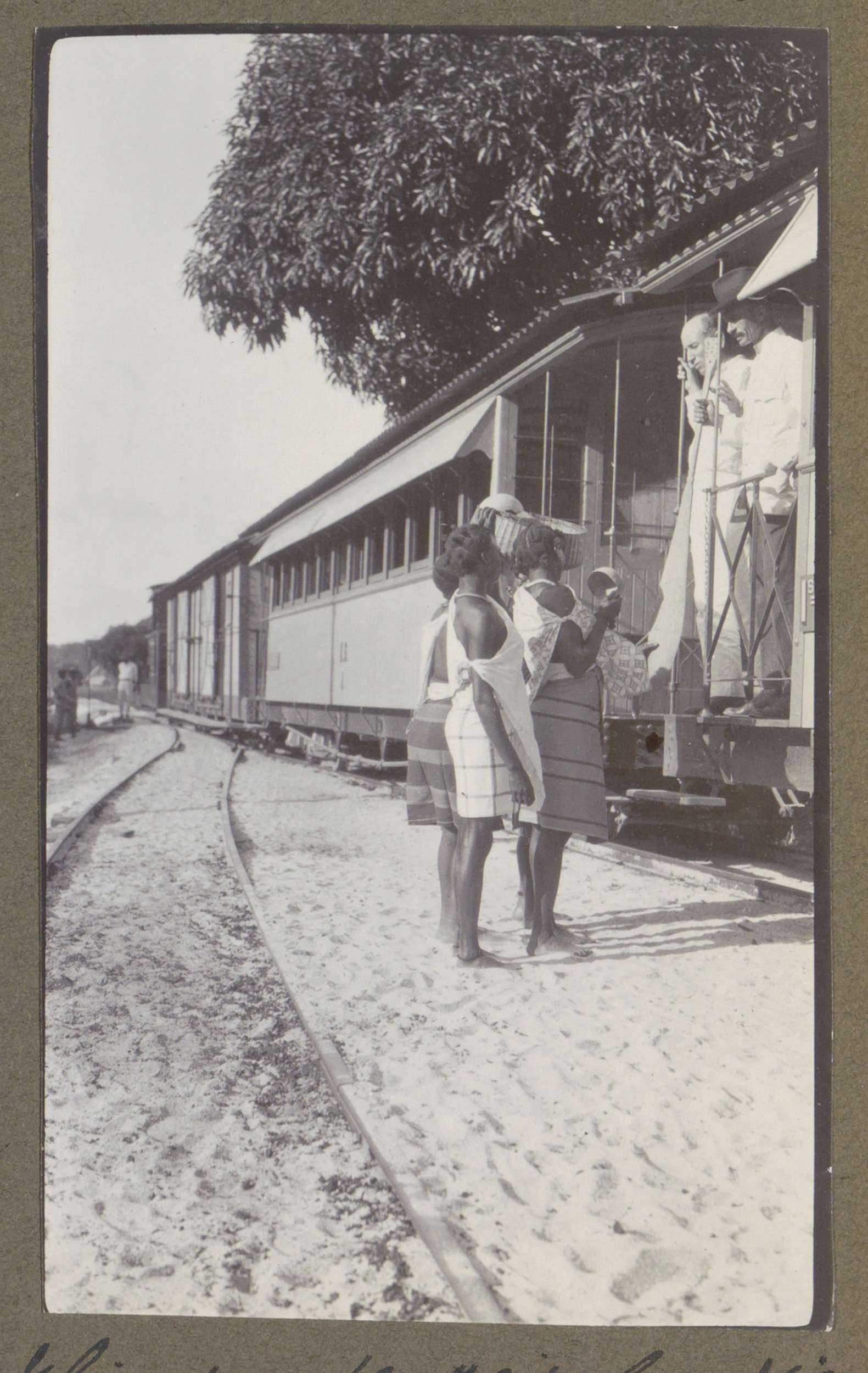 Twee Marronvrouwen verkopen hun waren aan treinpassa...