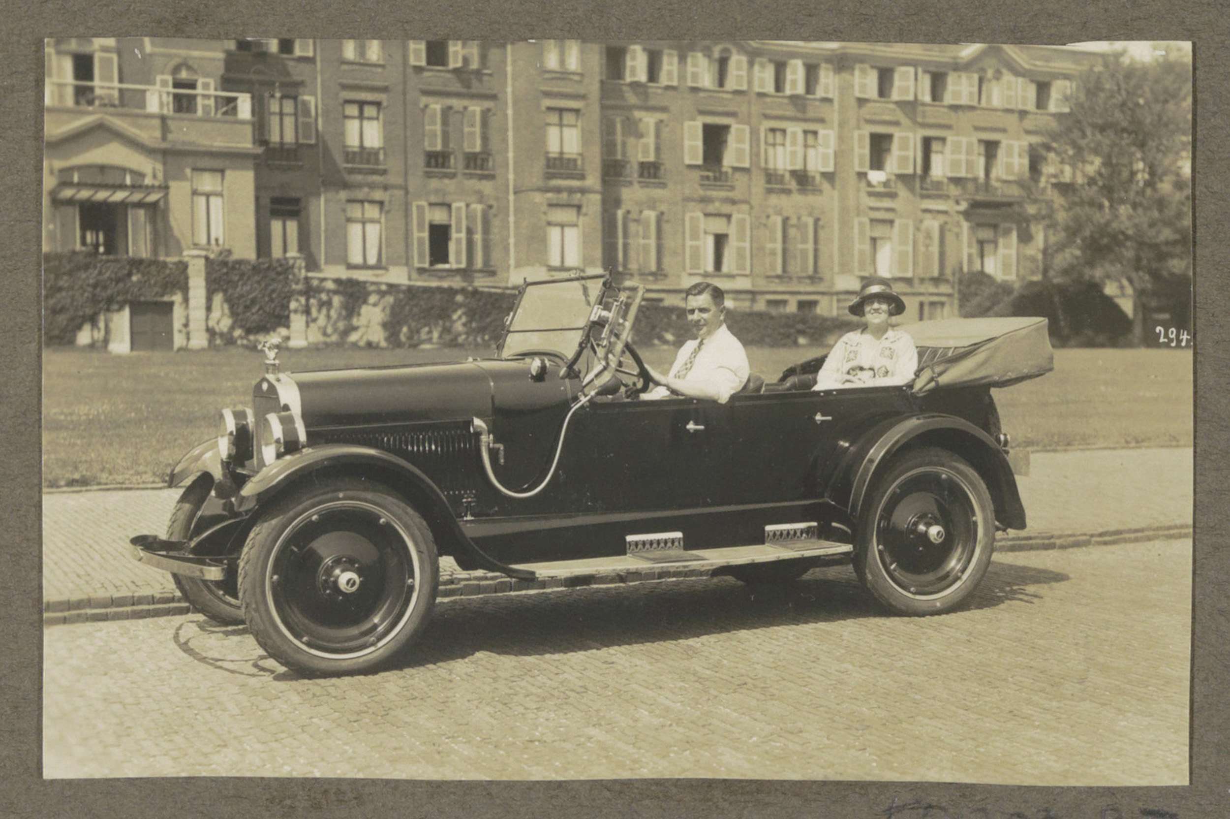 Man en vrouw zittend in een auto, mogelijk in Scheve...