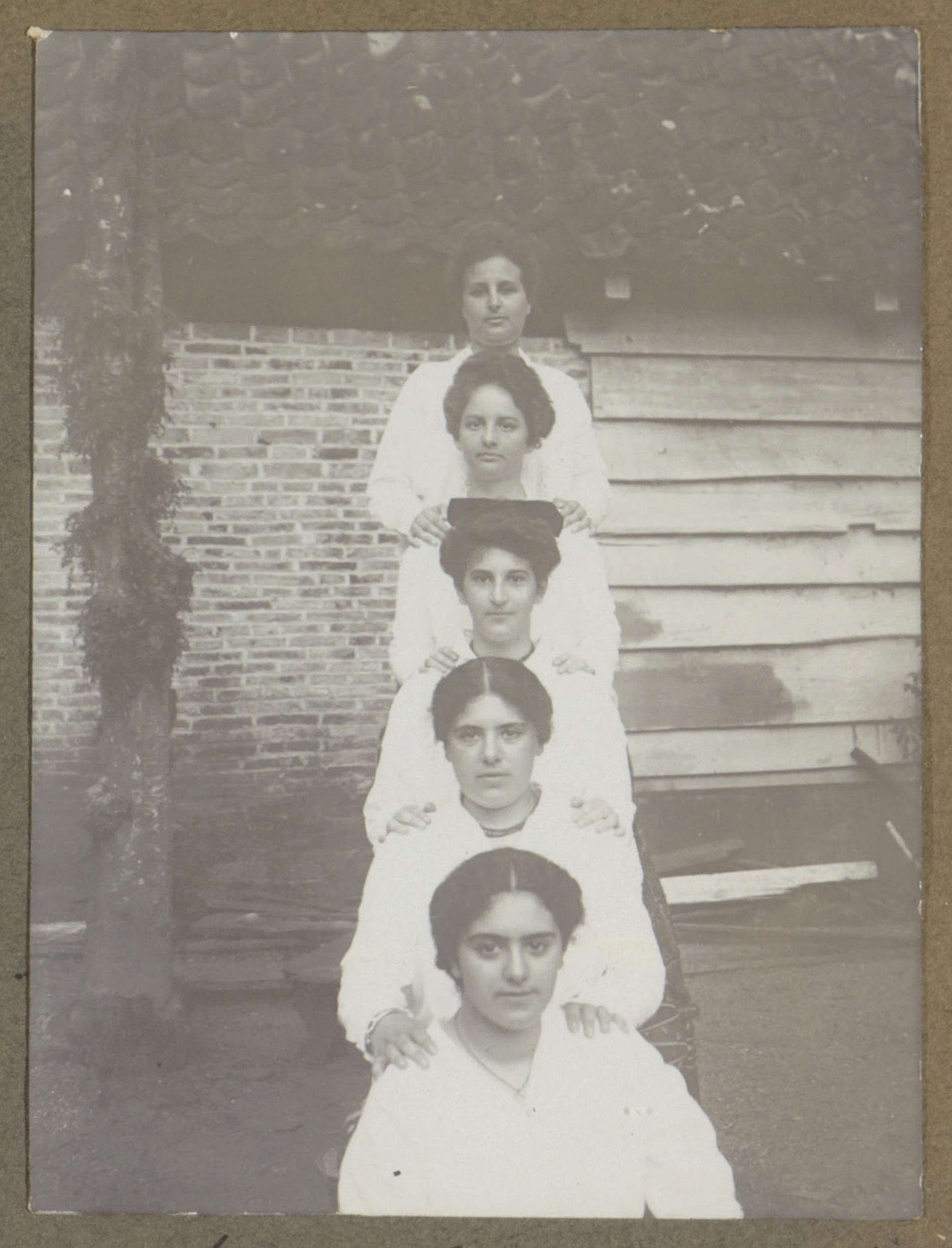 Groepsportret van jonge vrouwen in een ruimte met be...