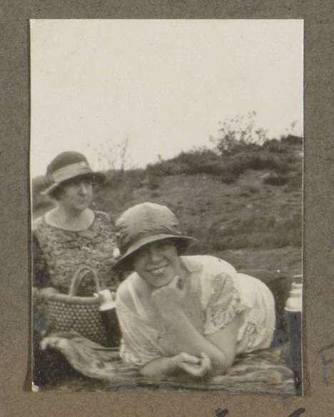 Twee vrouwen met hoeden picknickend op de hei bij Am...
