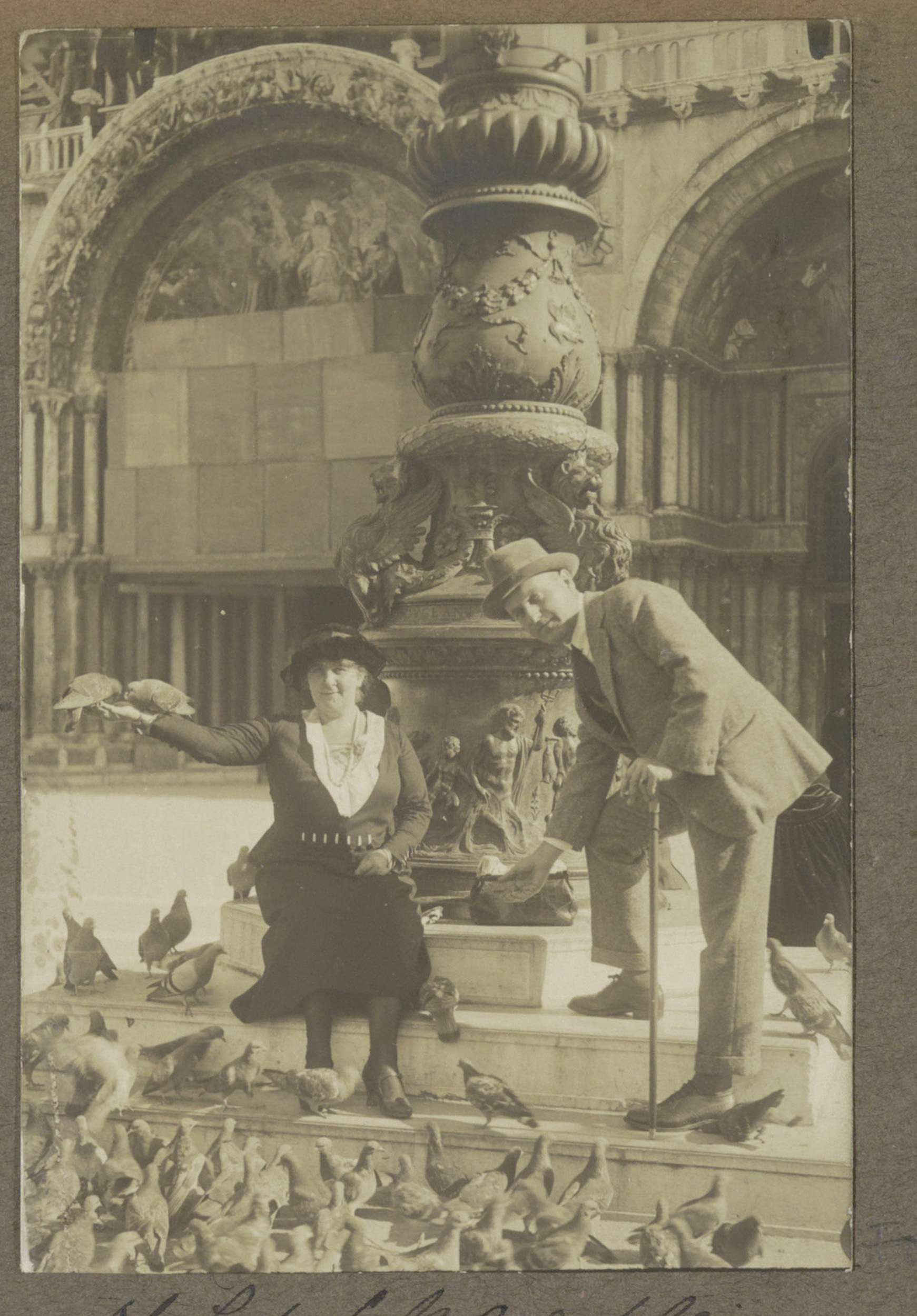 Man en vrouw tussen de duiven op het San Marcoplein ...