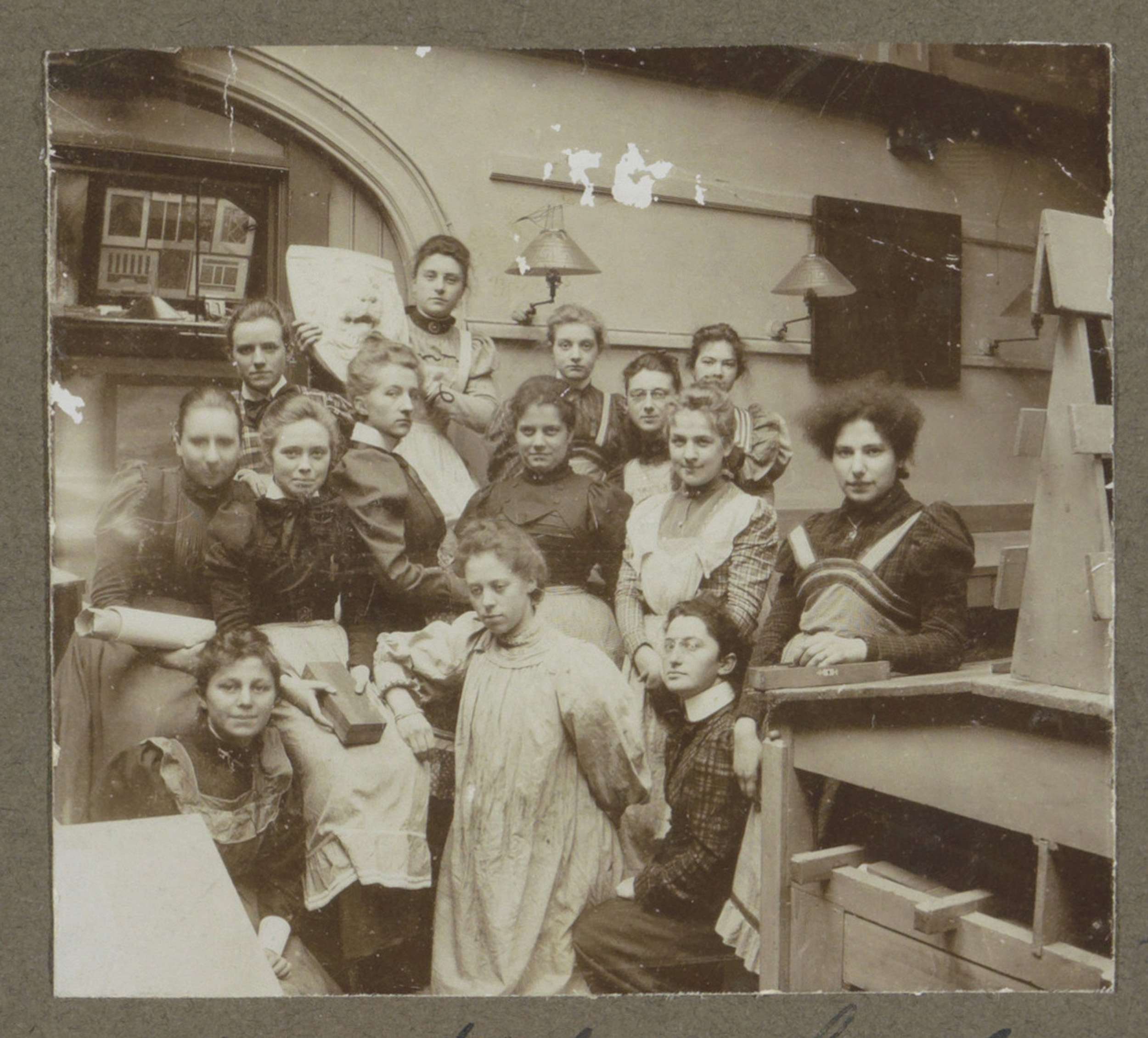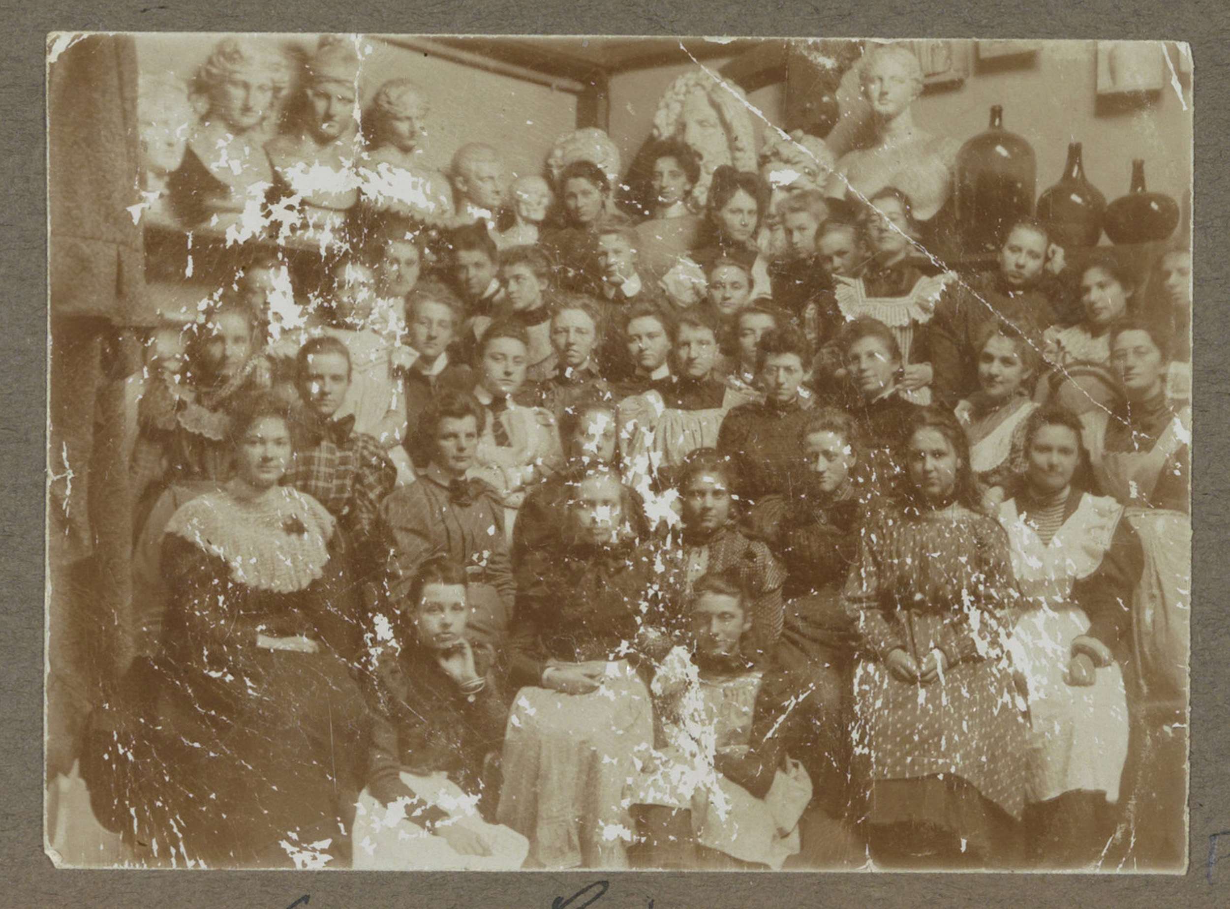 Groepsportret van jonge vrouwen in een tekenschool, ...