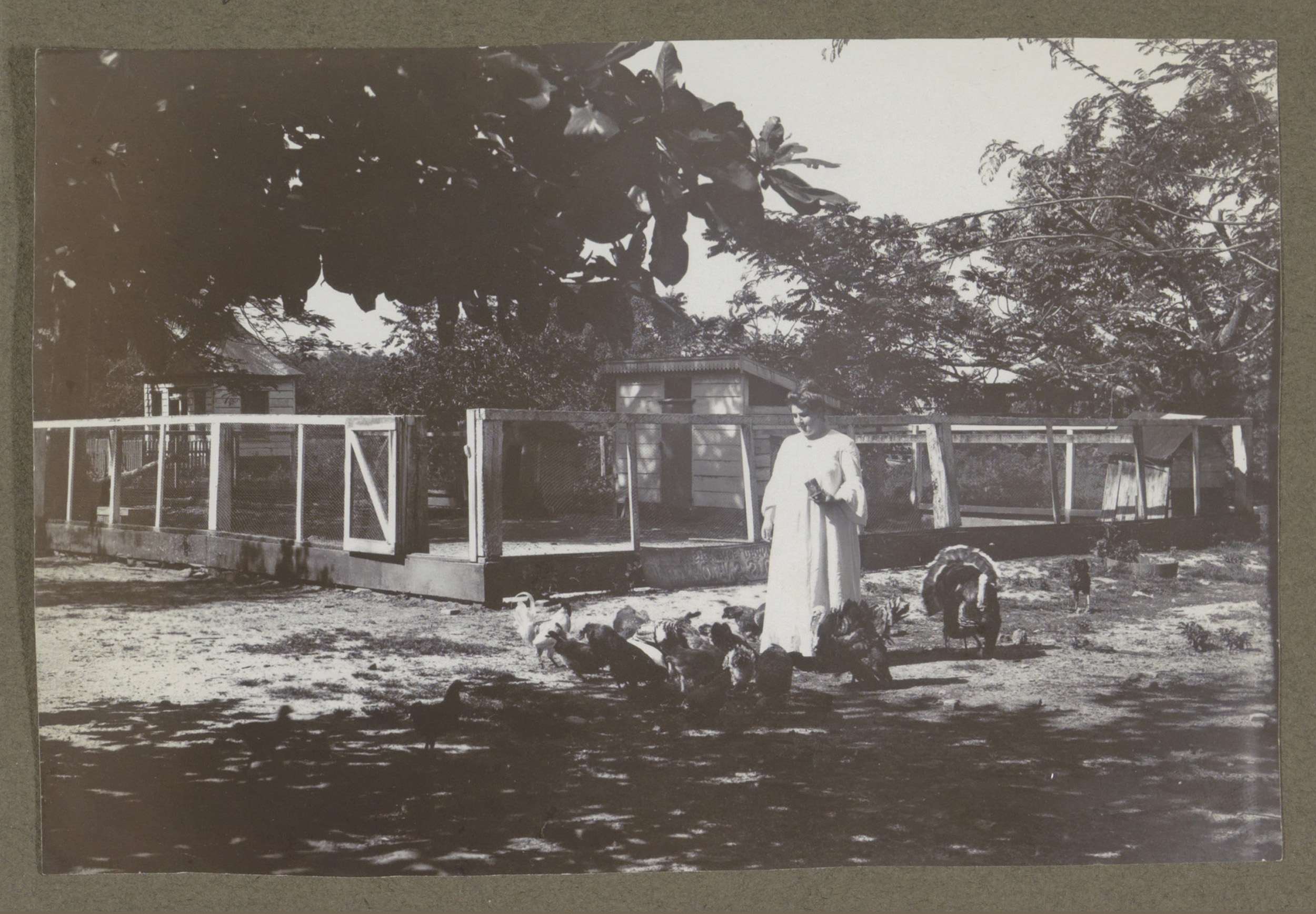 Vrouw voert de kippen op plantage ''t Vertrouwen' in...