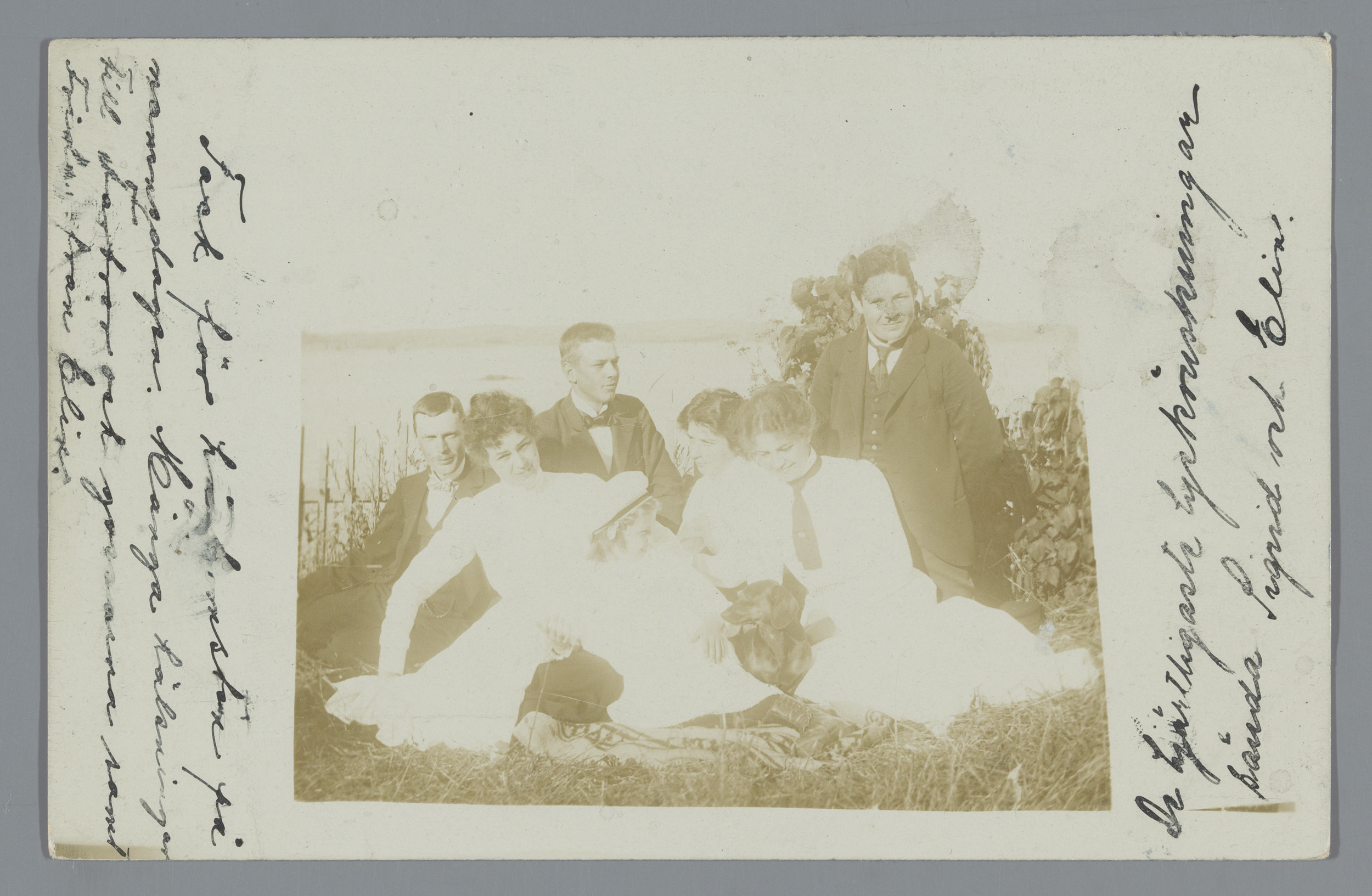Groepsportret van vijf onbekende mannen in de Rue de...