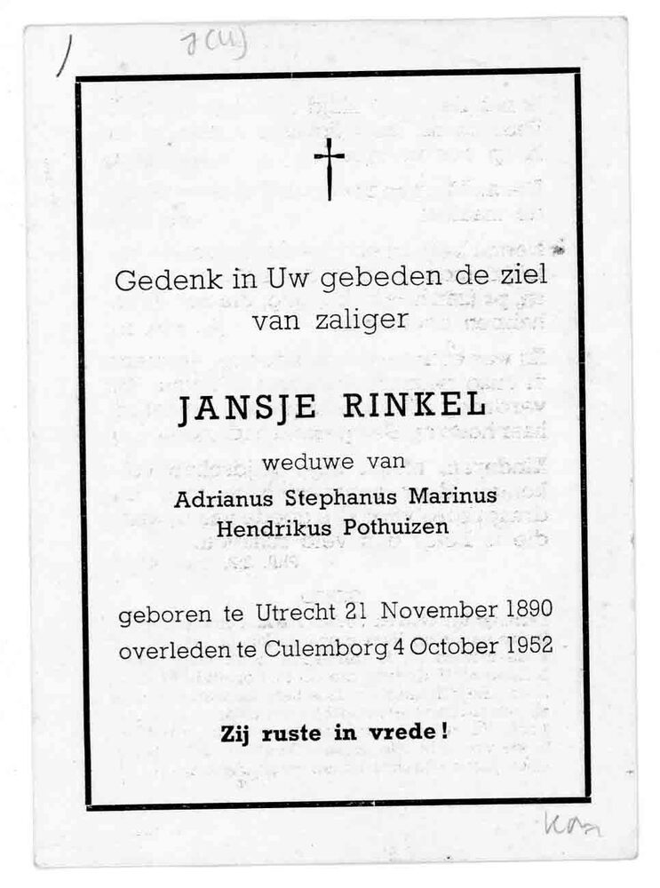 bidprent voor Jansje Rinkel. Geboren 21-11-1890 te U...