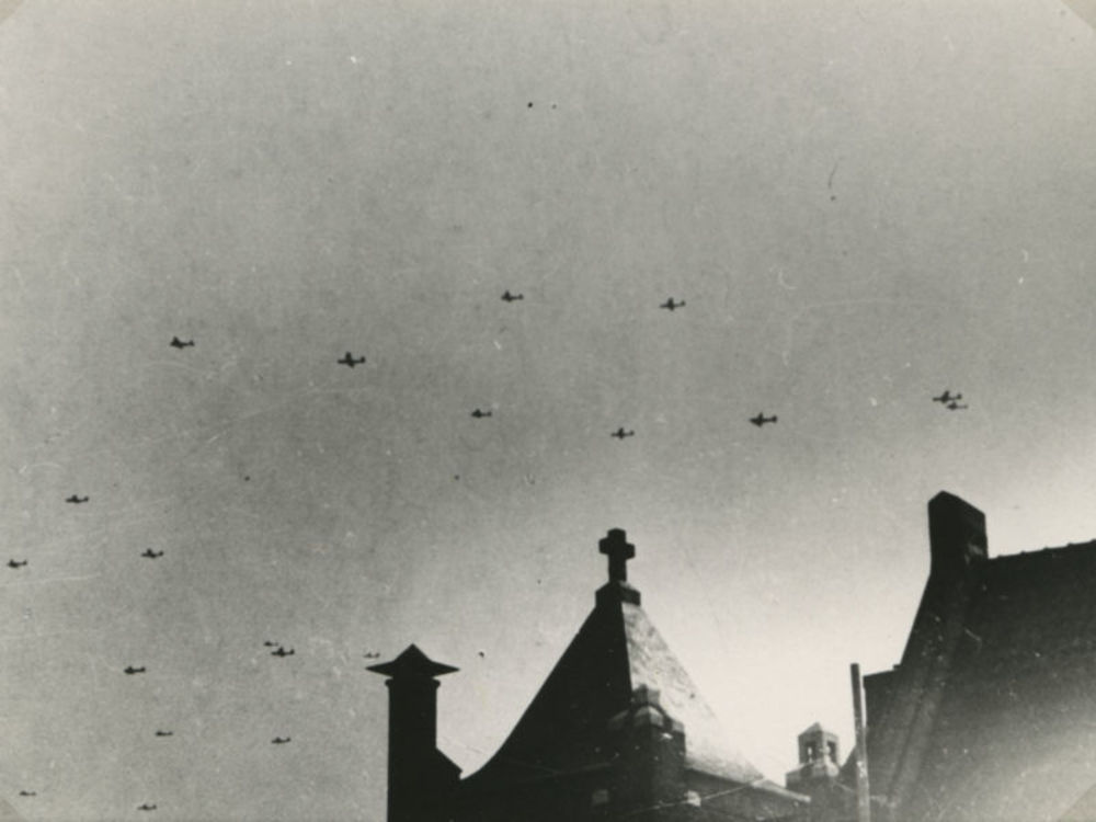 Foto van formatie C-47 Dakota's boven klooster.