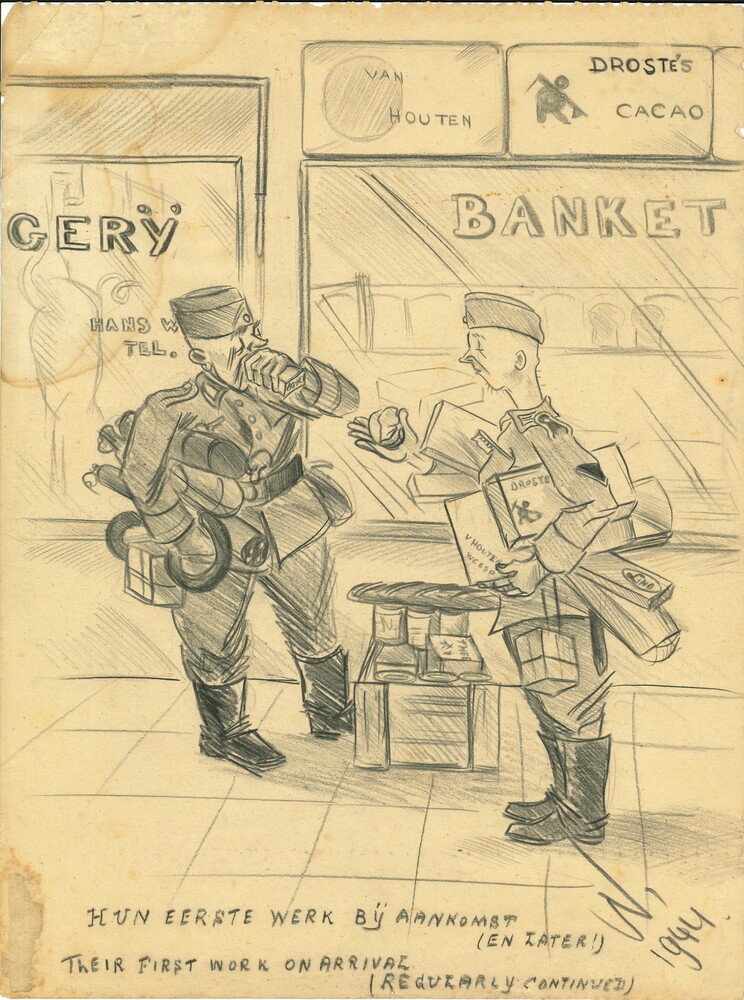 Tekening van twee militairen door J. Nieuwenhuys, 1944.