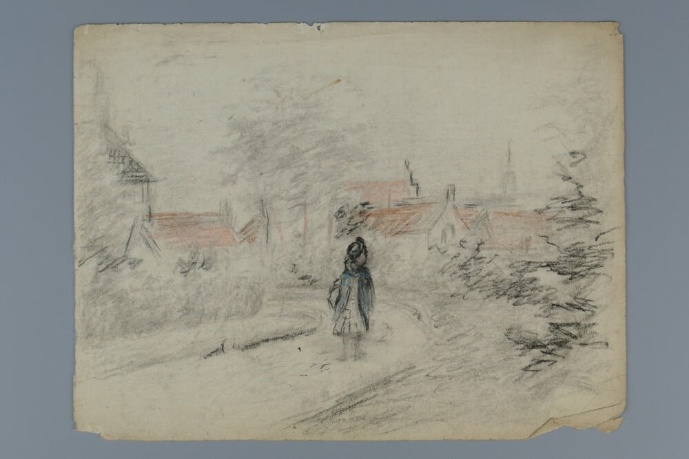 Potloodtekening, voorstellende meisje op een weg, ca...