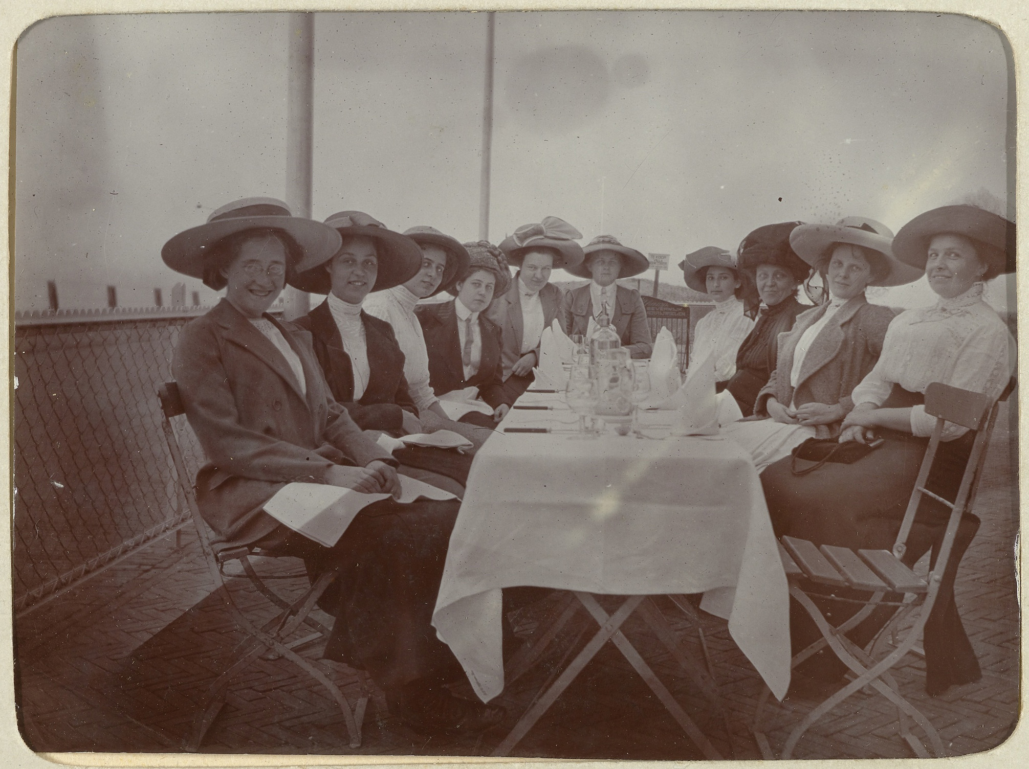 Groepsportret van vrouwen aan een gedekte tafel op e...