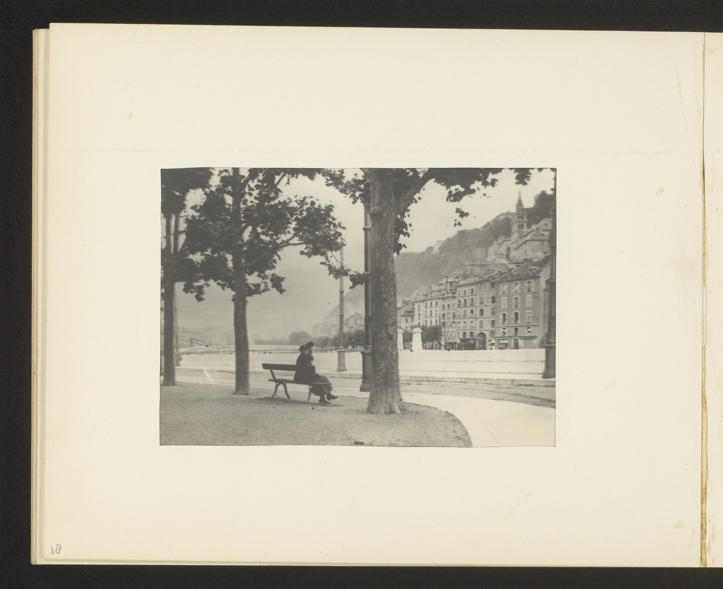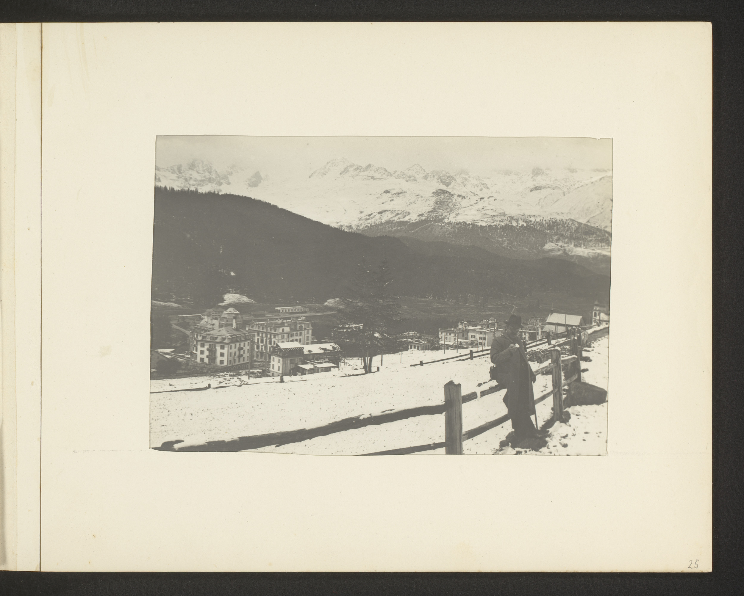 Vier mensen in een berglandschap, gezien vanuit een ...