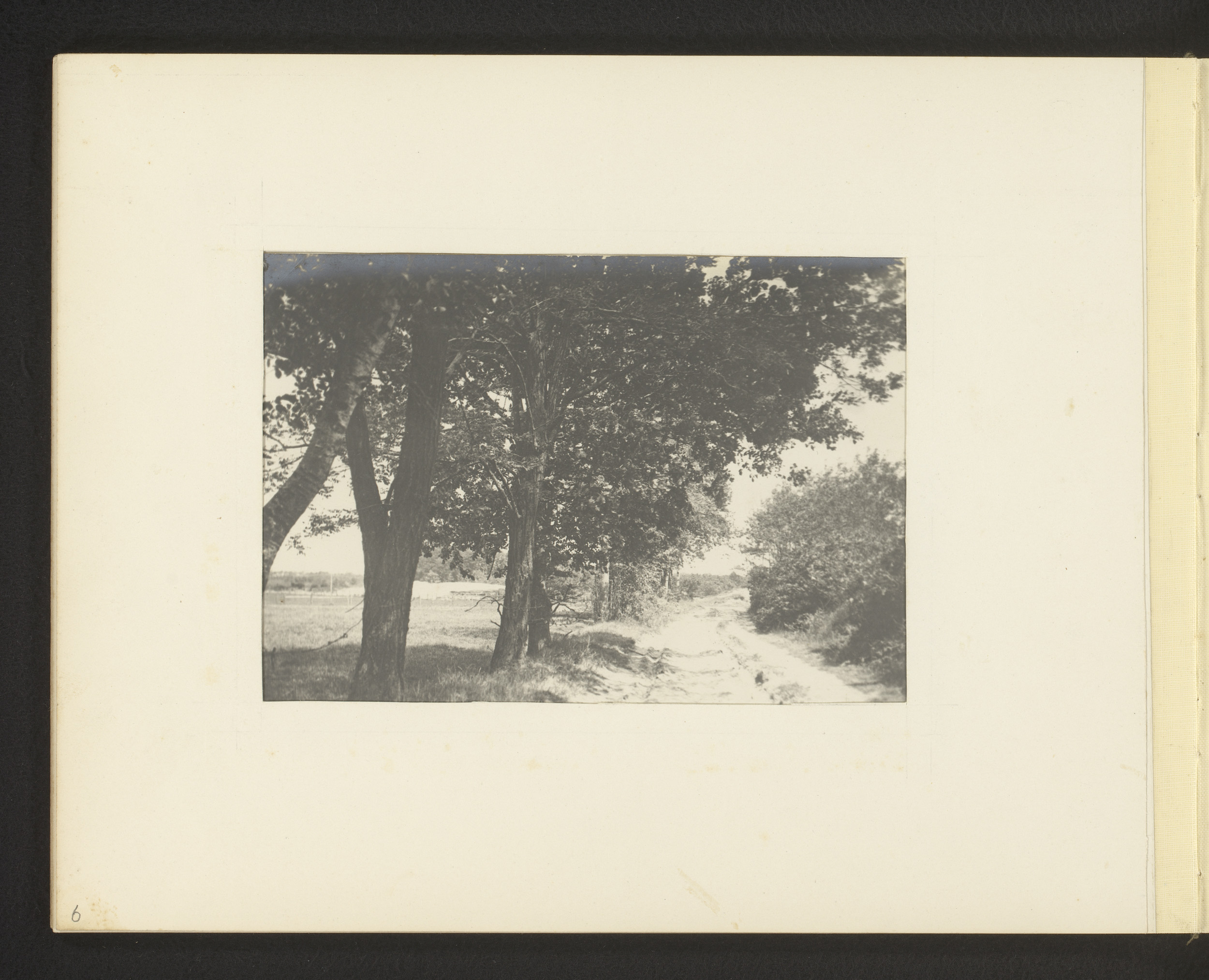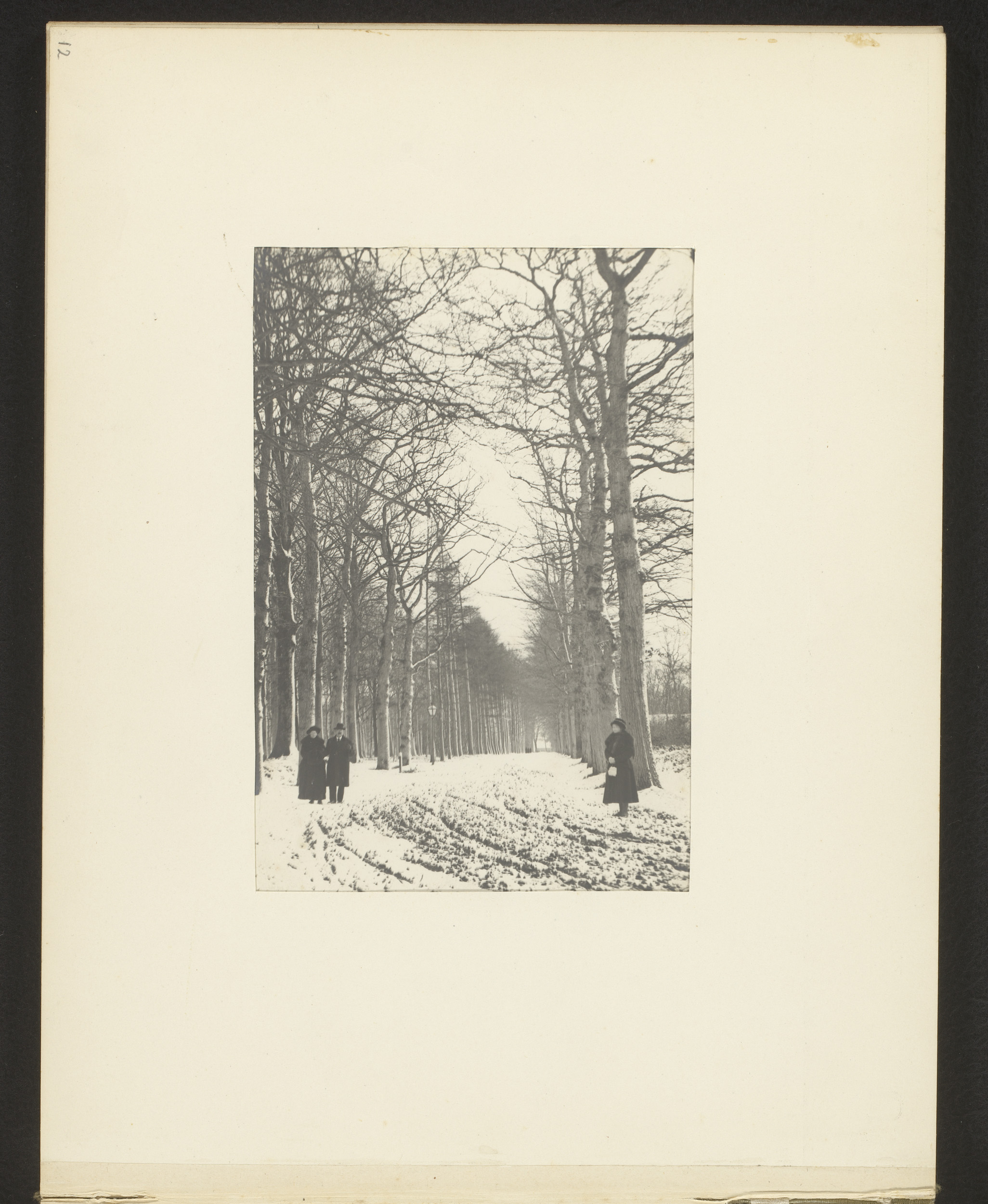 Gezicht op een besneeuwde laan met op de voorgrond t...