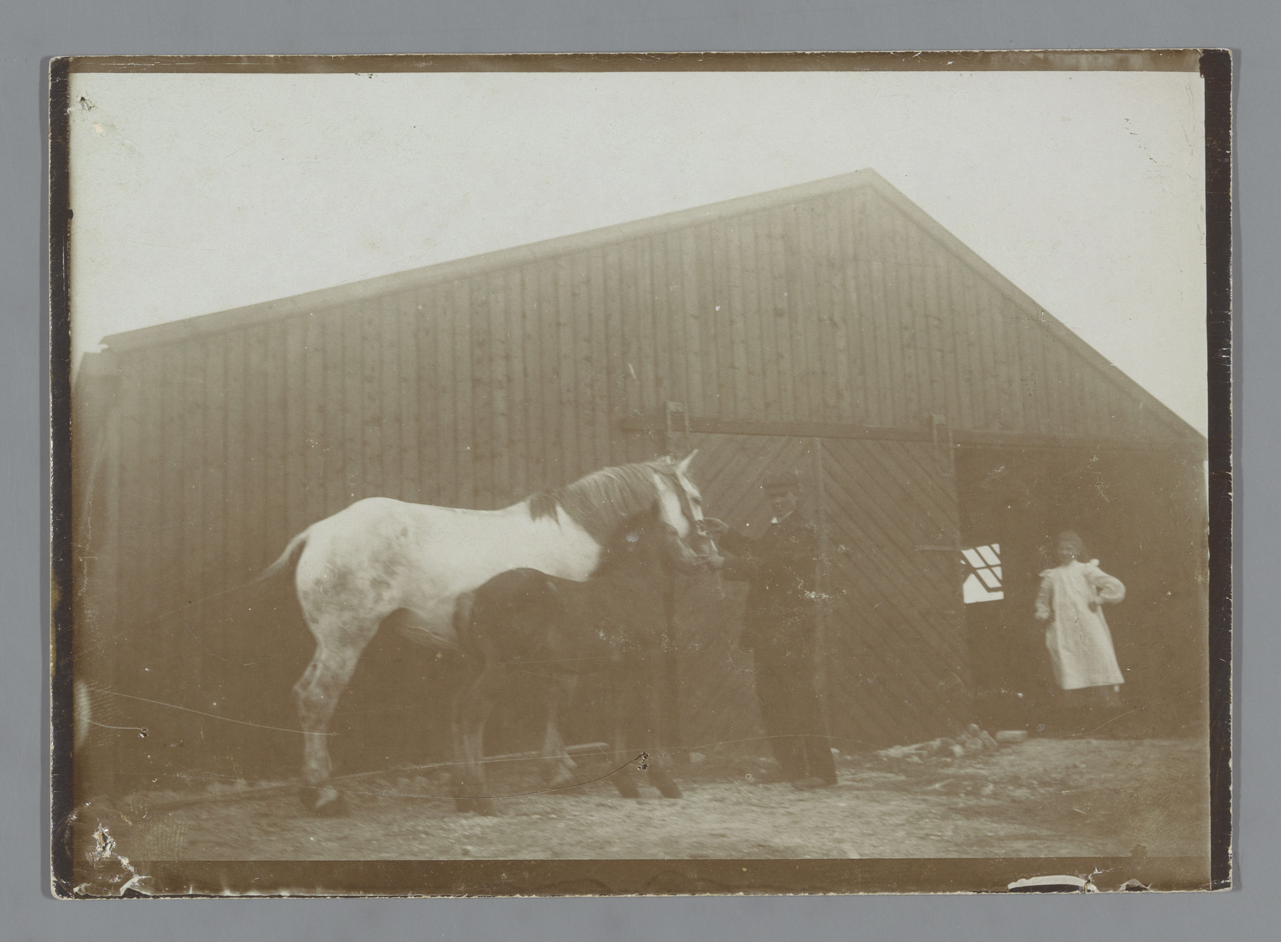 Man met een paard en een veulen voor een stal