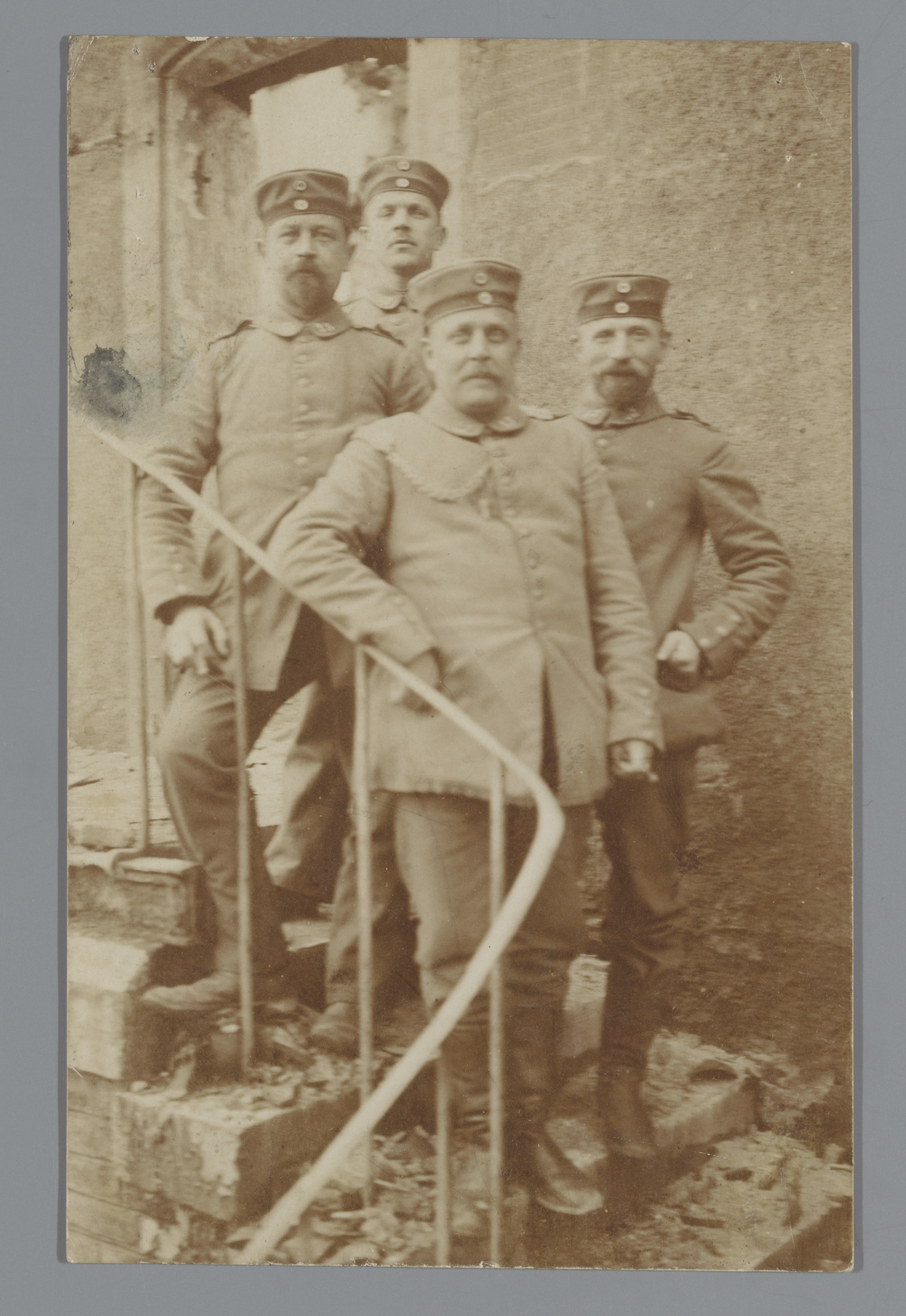 Portret van vier onbekende mannen in uniform op een ...