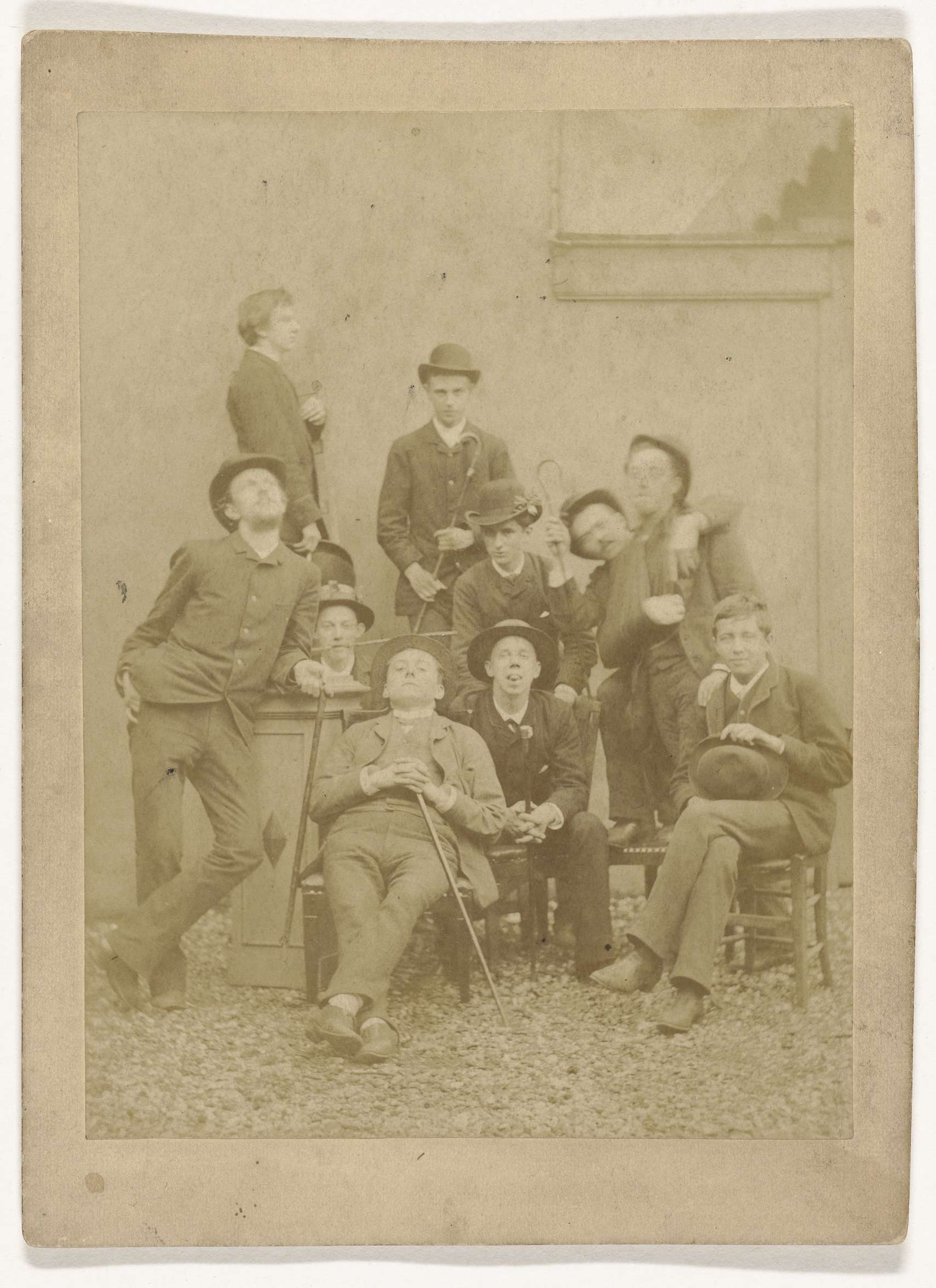 Groepsportret van een verkleed toneelgezelschap