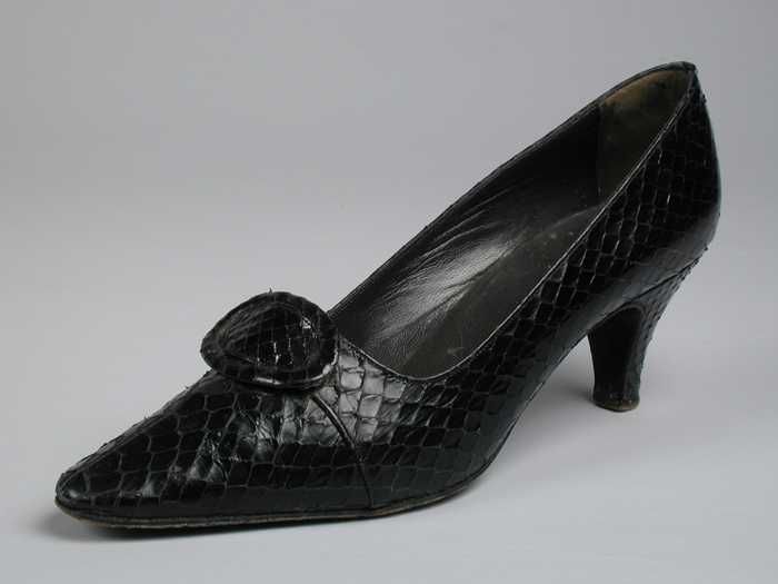 Zwarte reptielenleren pumps met ovale siergesp op de...