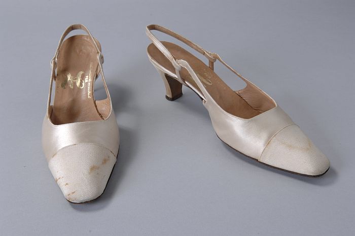 Roomwitte satijnen slingbacks, spitse neus bekleed m...
