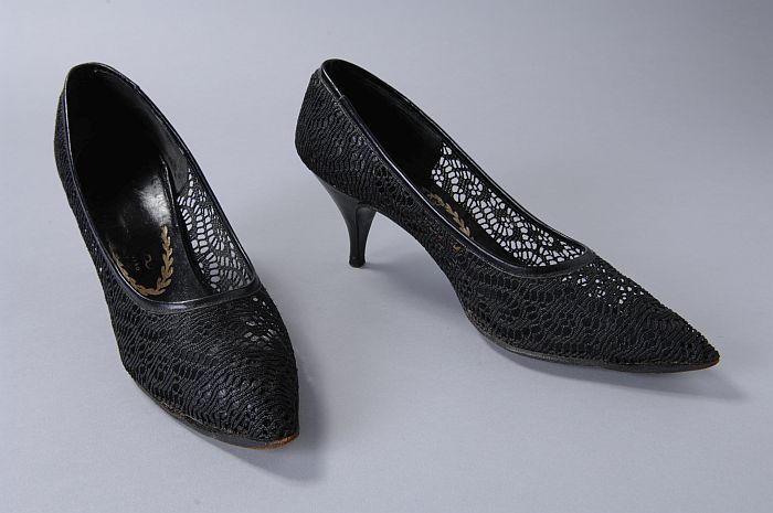 Zwarte pumps van ajour gebreide kunstvezel met spits...