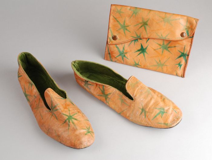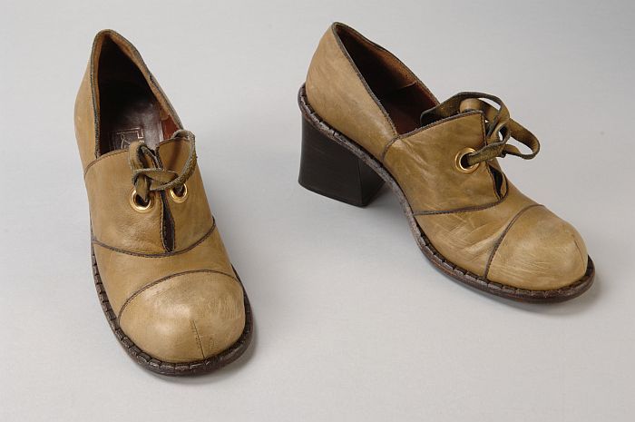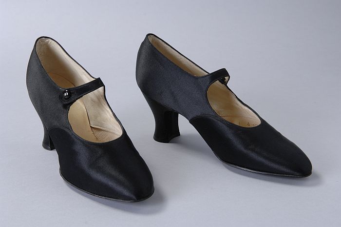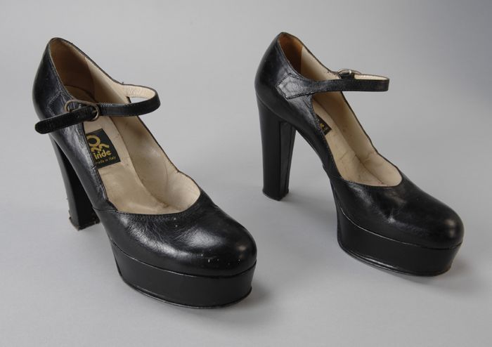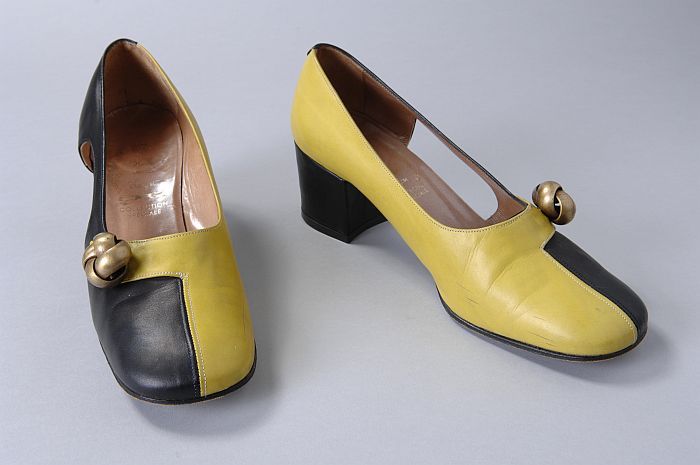 Felgeel met zwarte leren pumps, gele sierwreefband m...