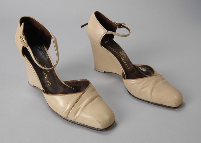 Crèmekleurige leren hakschoenen met bruine bies en z...