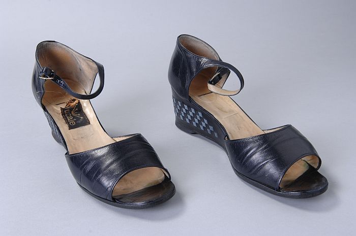 Donkerblauwe leren pumps met gevlochten spitse neus ...
