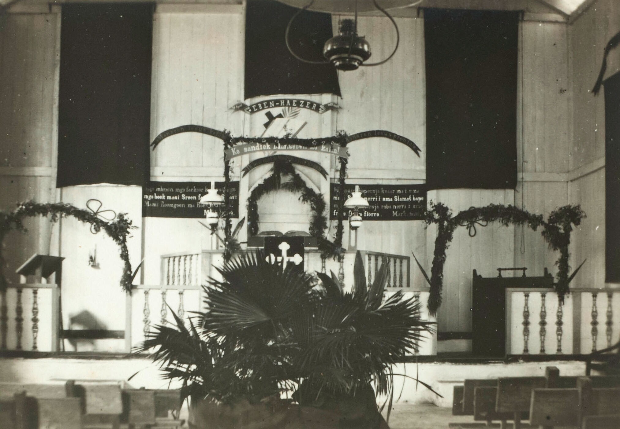 Het interieur van de kerk op Mansinam, versierd ter ...