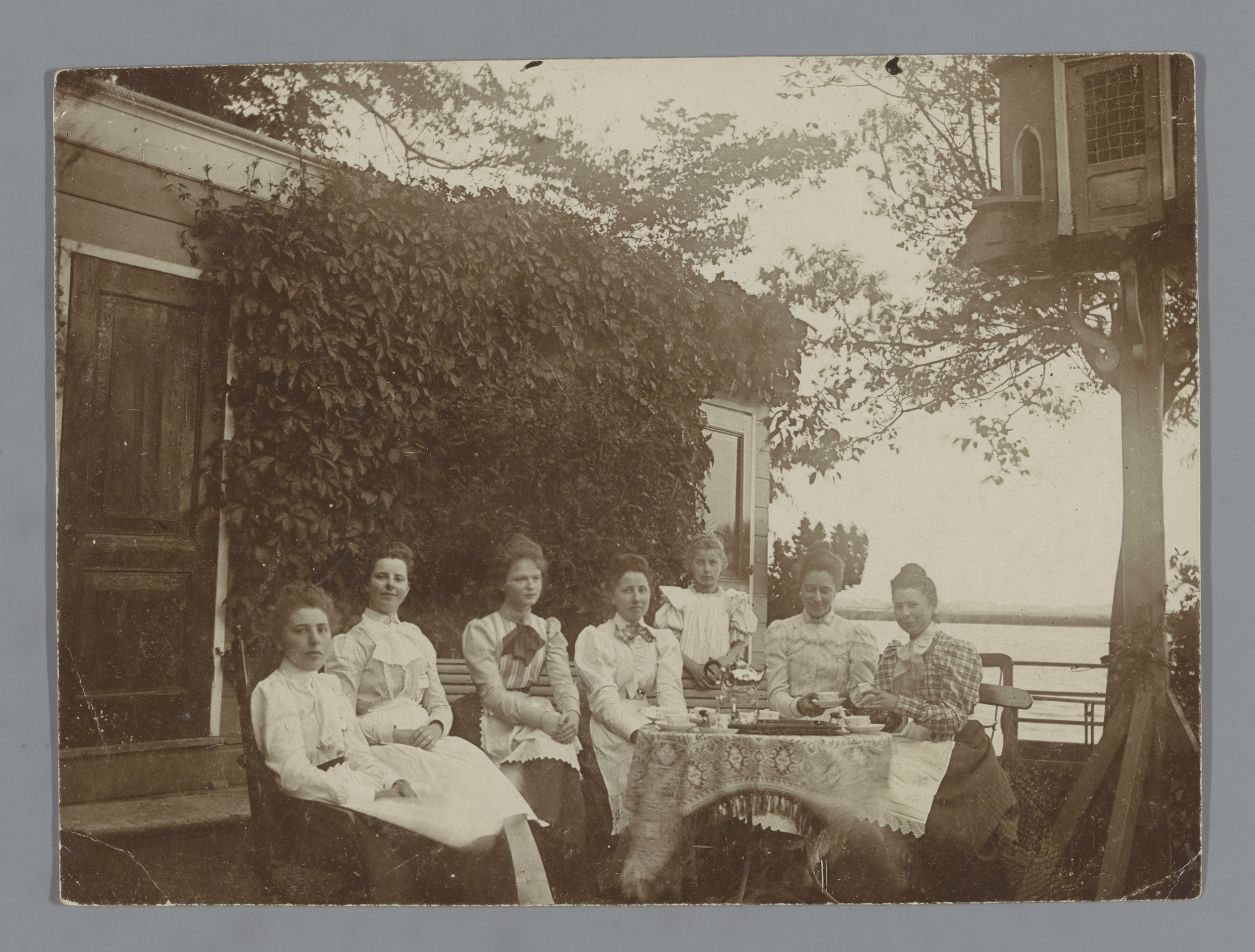 Groepsportret van zeven onbekende vrouwen in een tui...