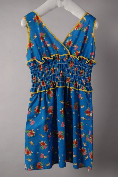 Blauwe mouwloze kinderjurk met een kleurig dessin va...