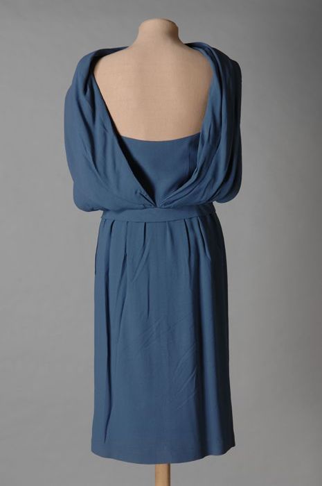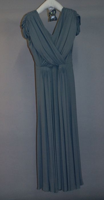 Lange grijsblauwe crêpe japon met draperie