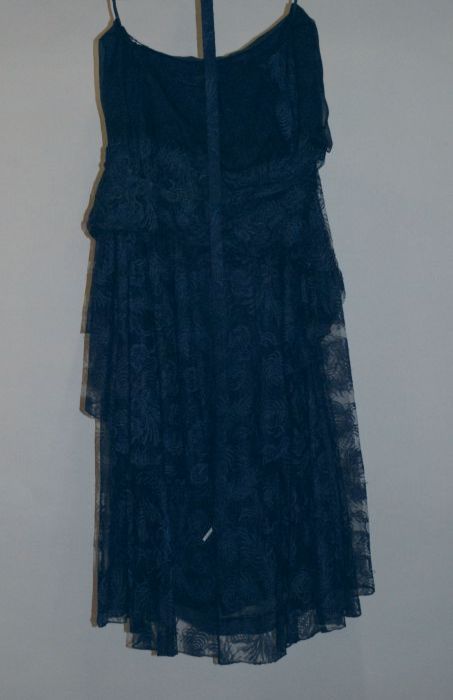 Donkerblauwe kanten avondjapon met driekwartmouw