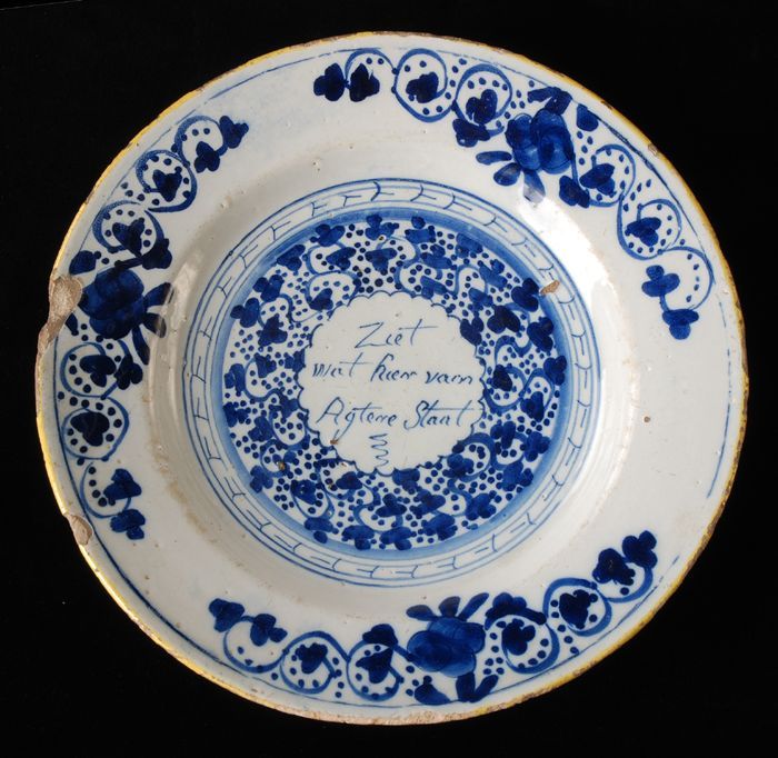 Faience bord met "Ziet wat hier van Agtere Staat", o...