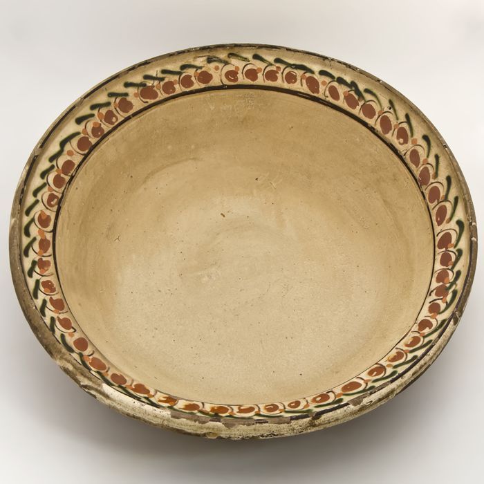 Grote aardewerk schotel met gedecoreerd rand in brui...