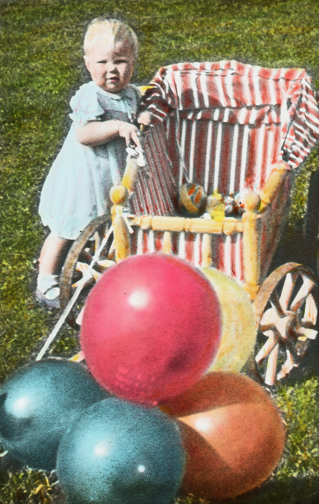 Klein kind met kinderwagen en ballen