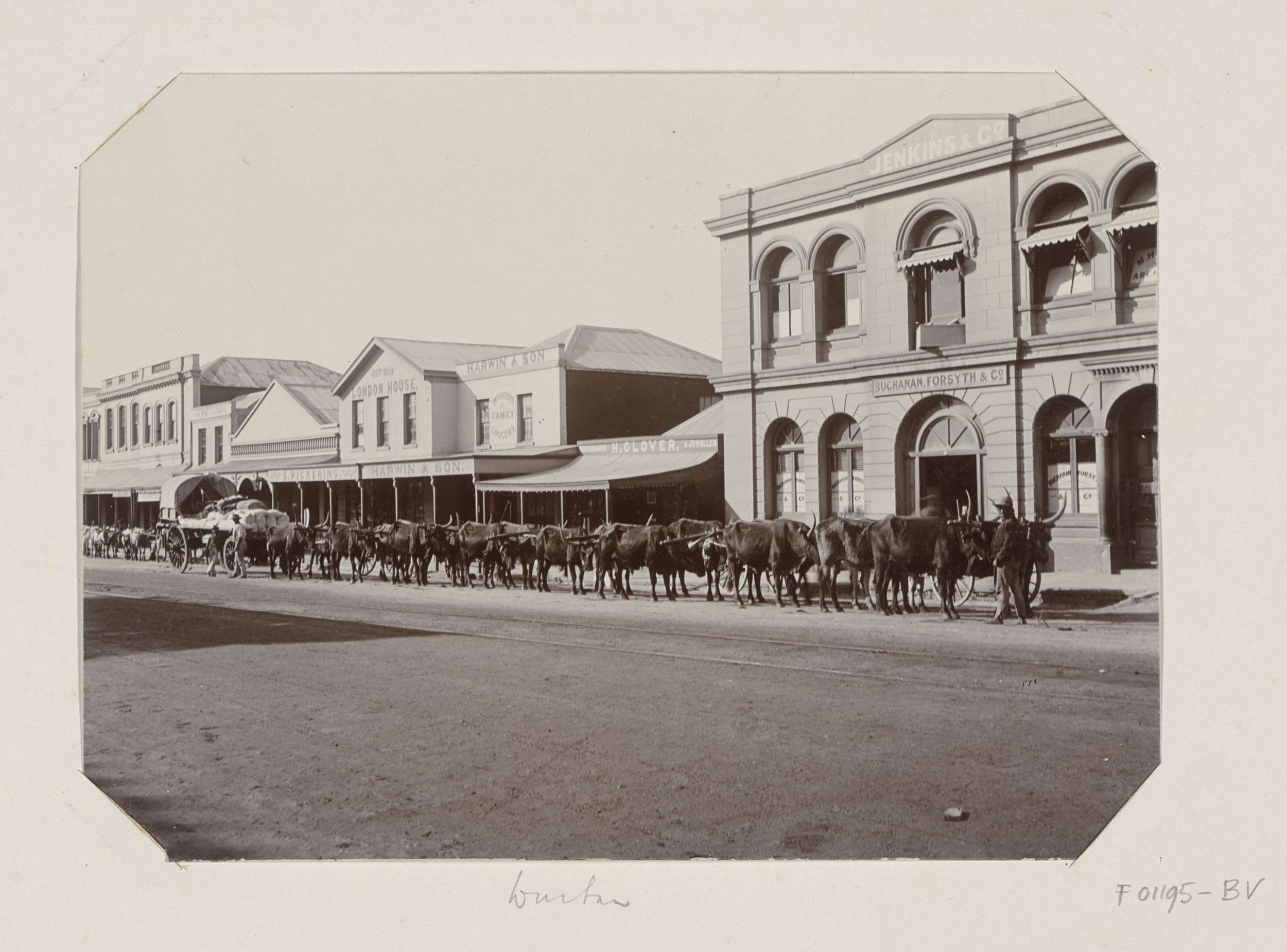 Ossen, ossenwagen en winkels in een straat in Durban