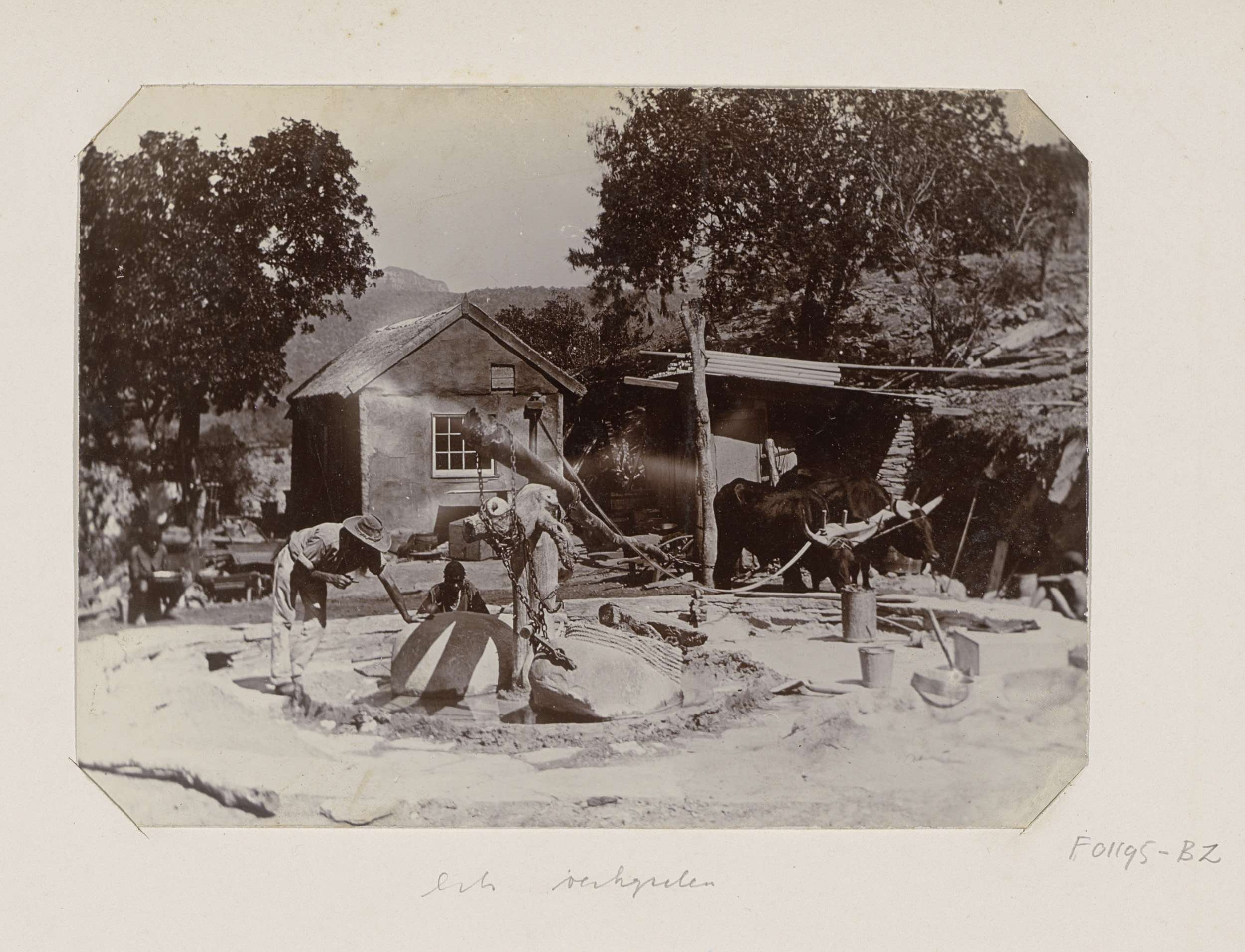Arbeiders aan het werk bij een ossenmolen in Zuid-Af...