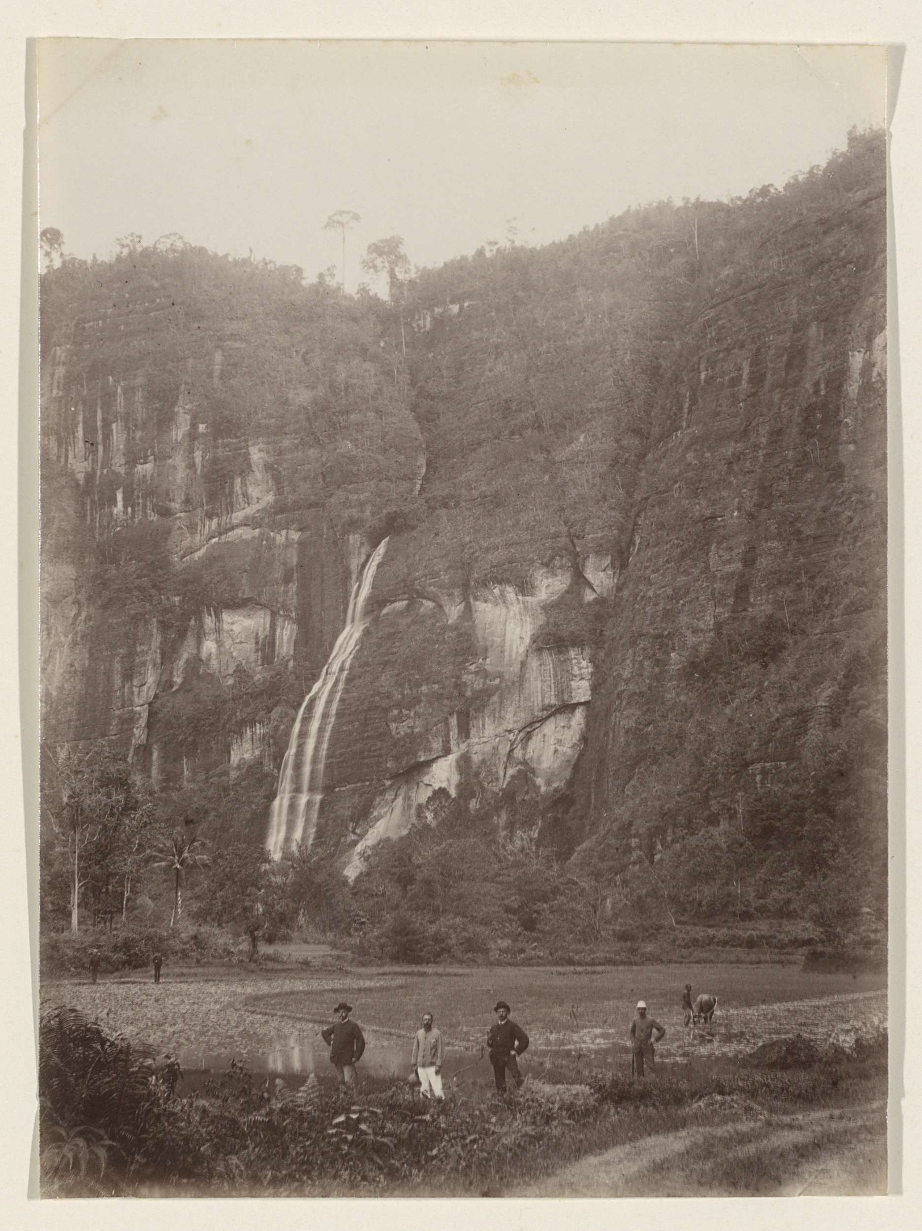 Mannen in een akker in Nederlands-Indië met op de ac...