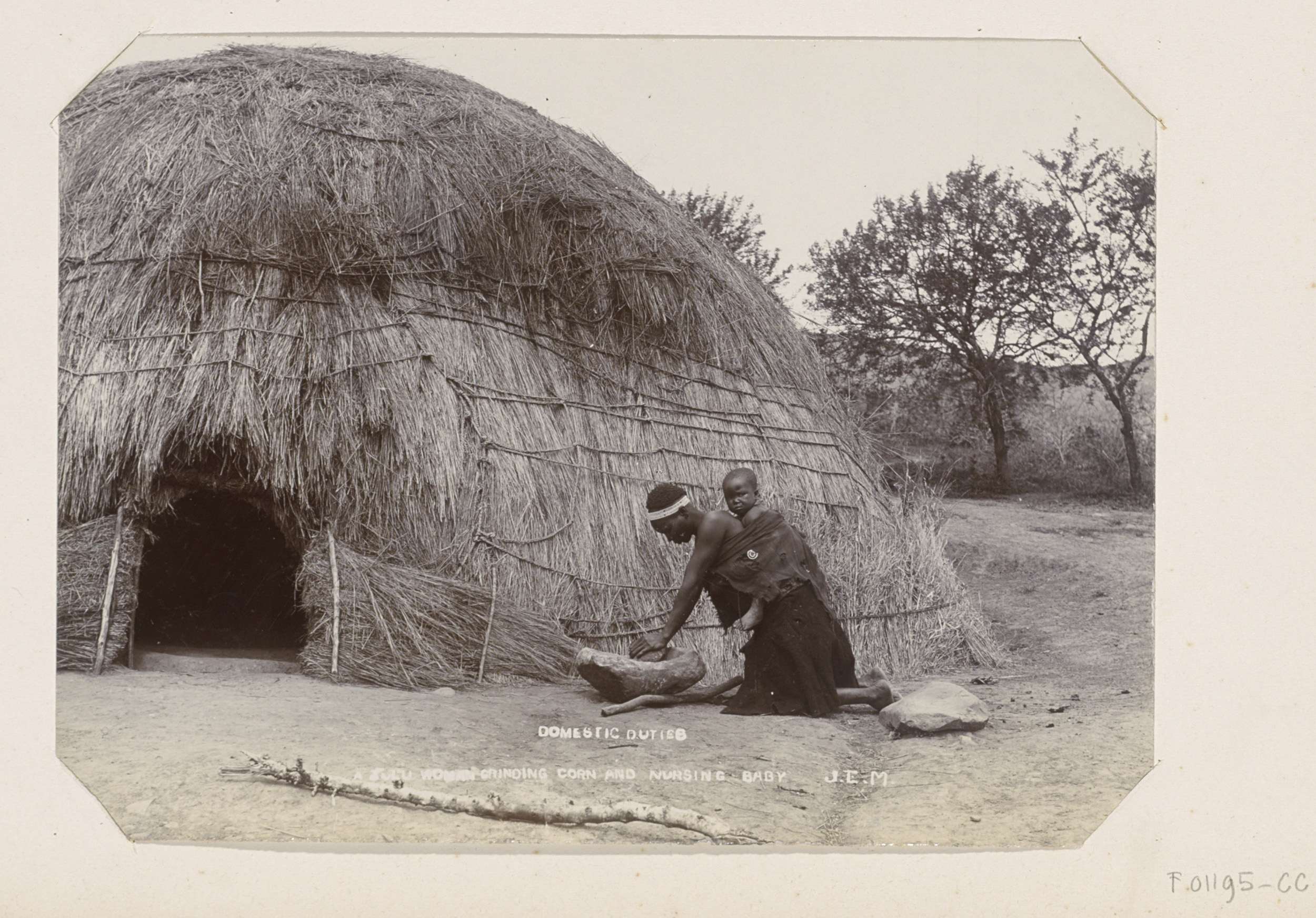 Zoeloevrouw met baby op de rug maalt graan met de ha...