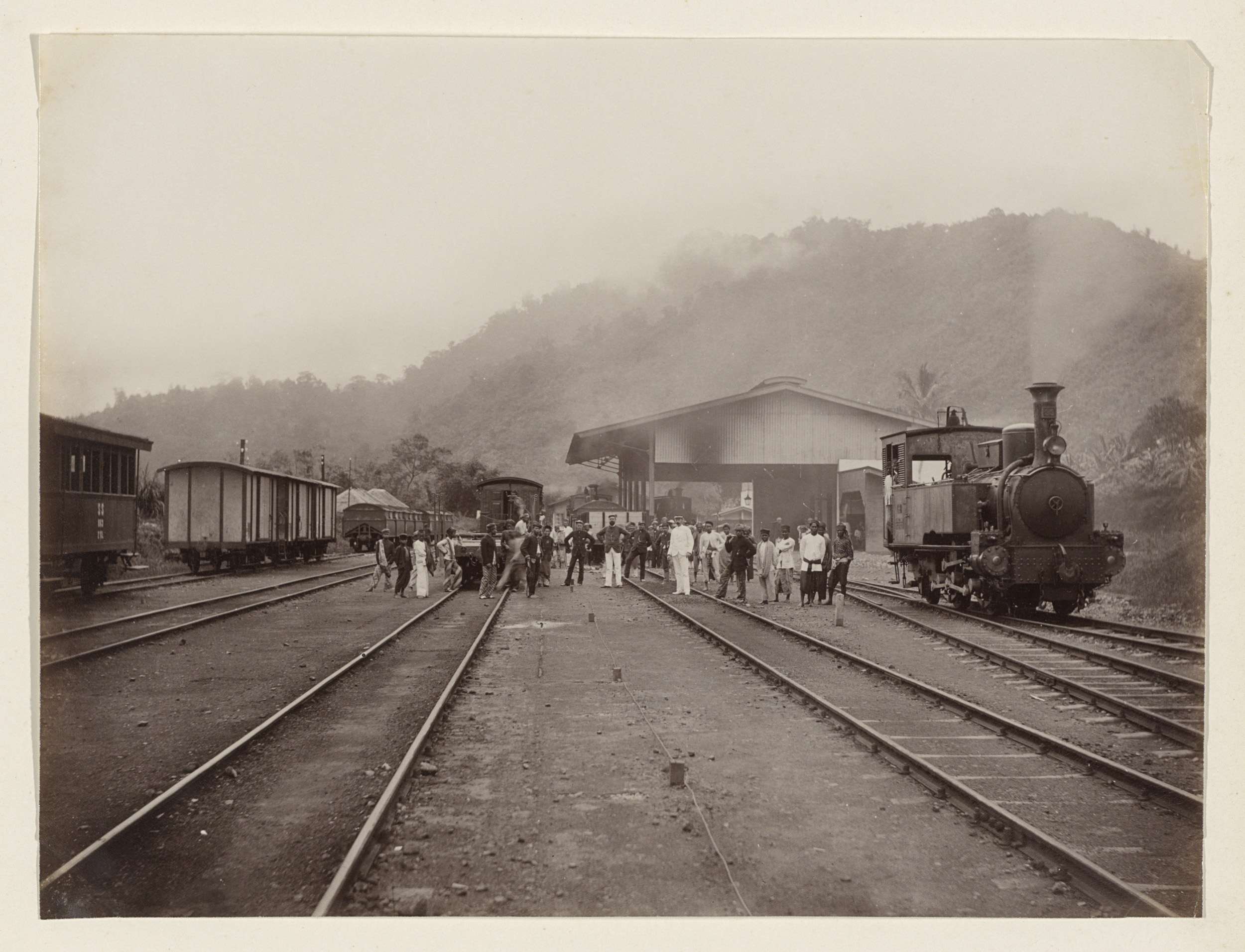 Mensen, locomotief en wagons op een spoorwegstation ...