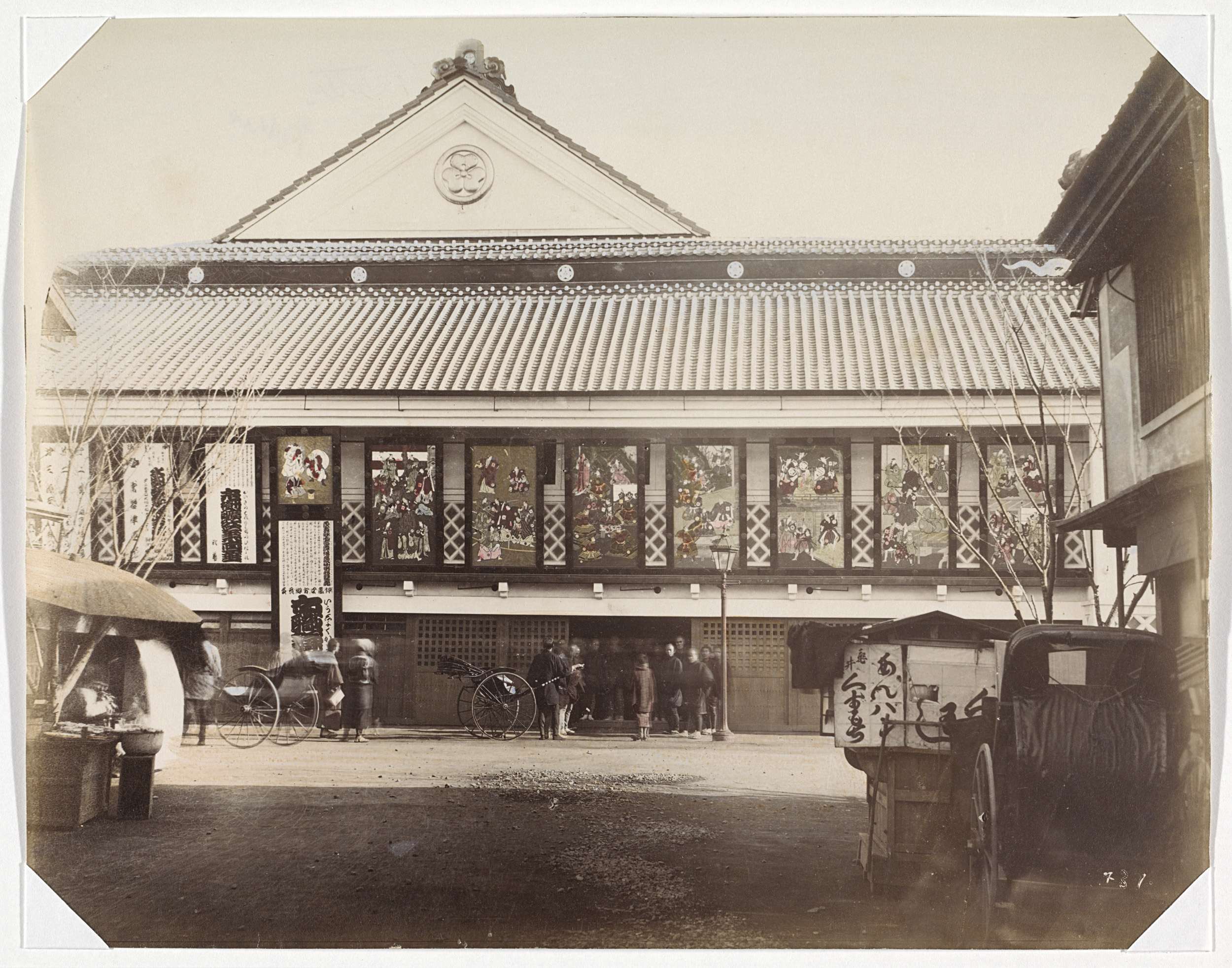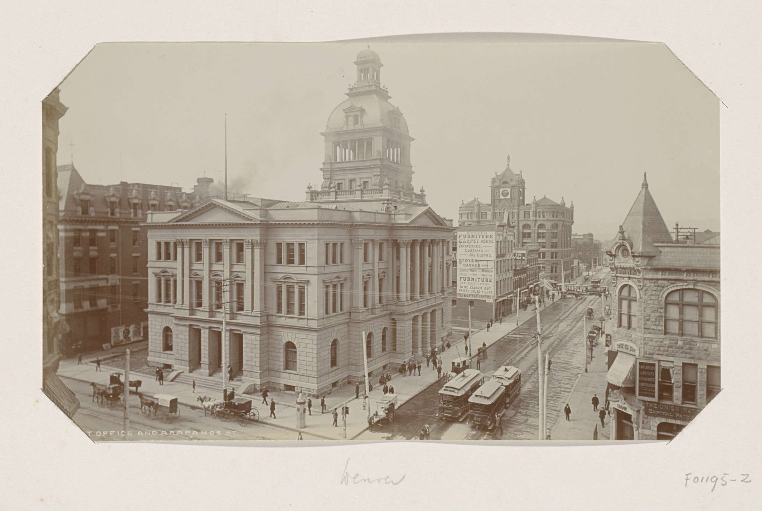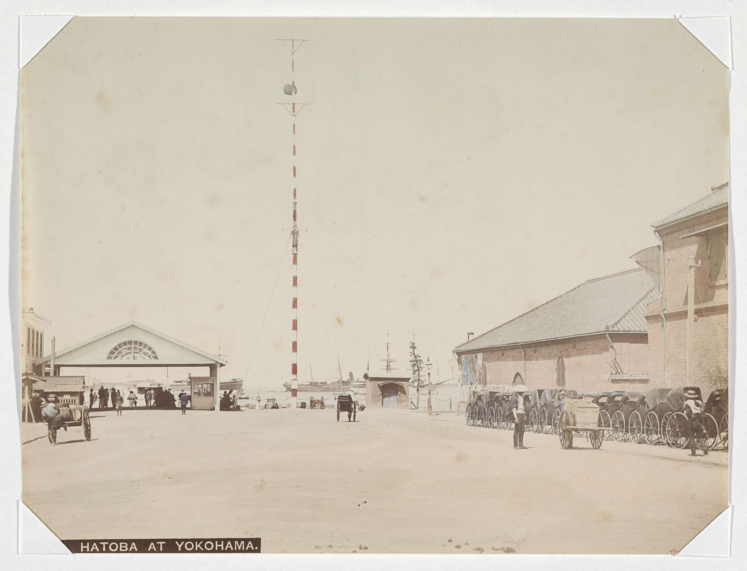 Voorbijgangers en paardenkoetsen bij het Central Hot...