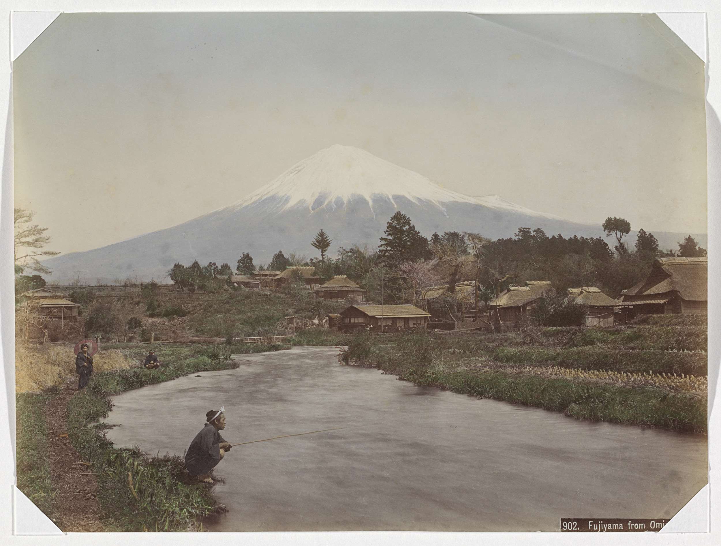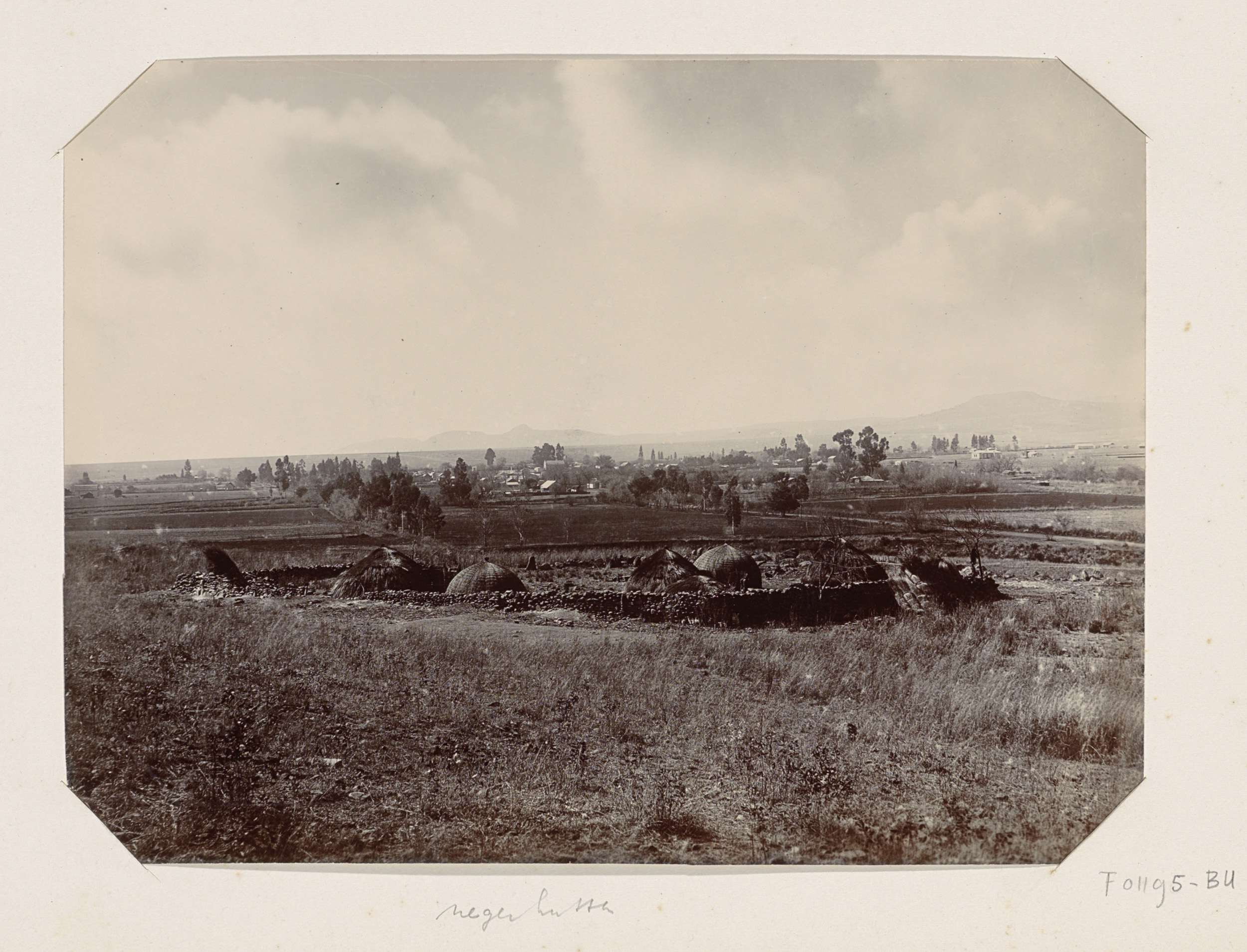 Gezicht op een dorp met op de voorgrond hutten, verm...