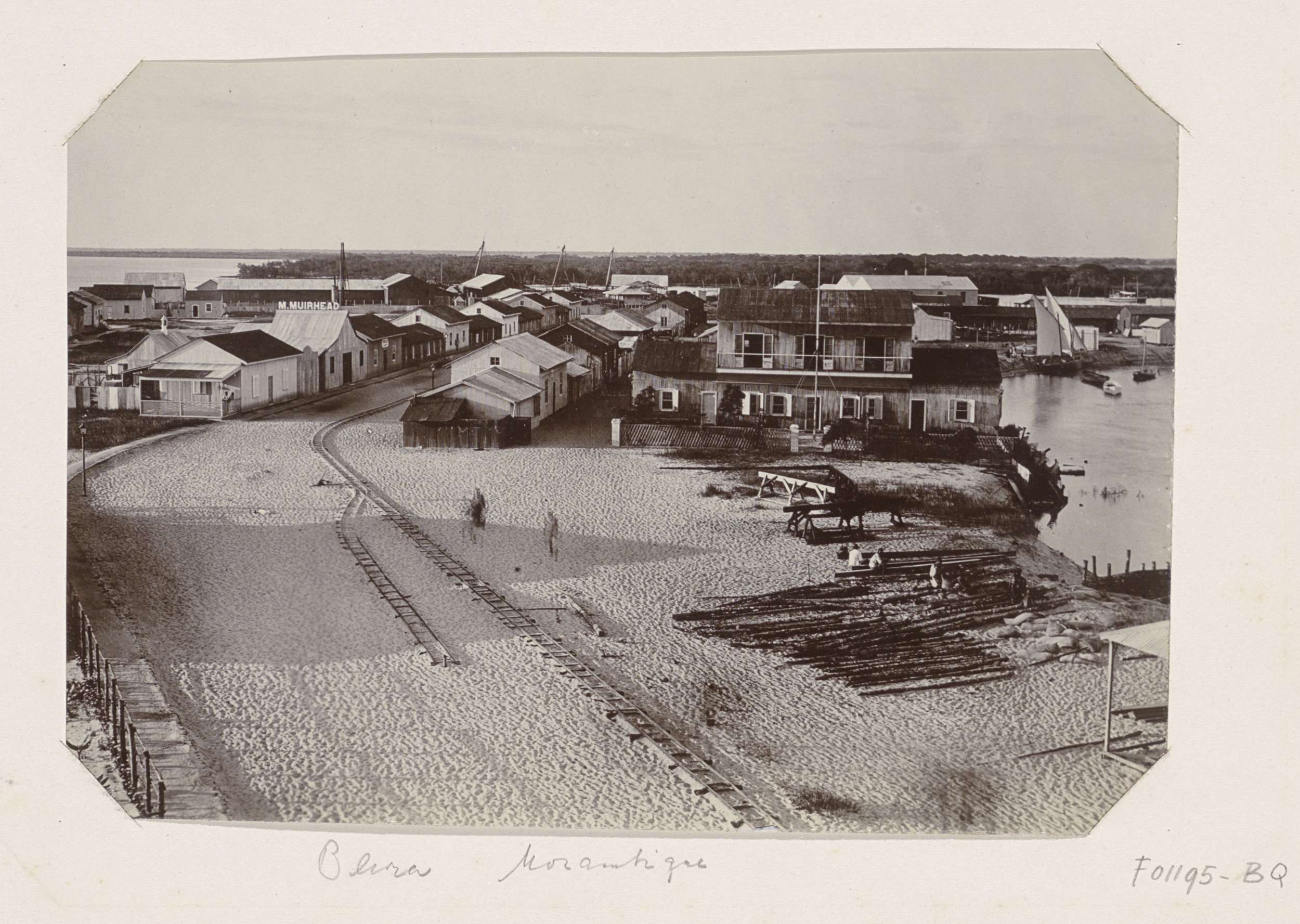 Dorp met spoorrails aan een water in Mozambique