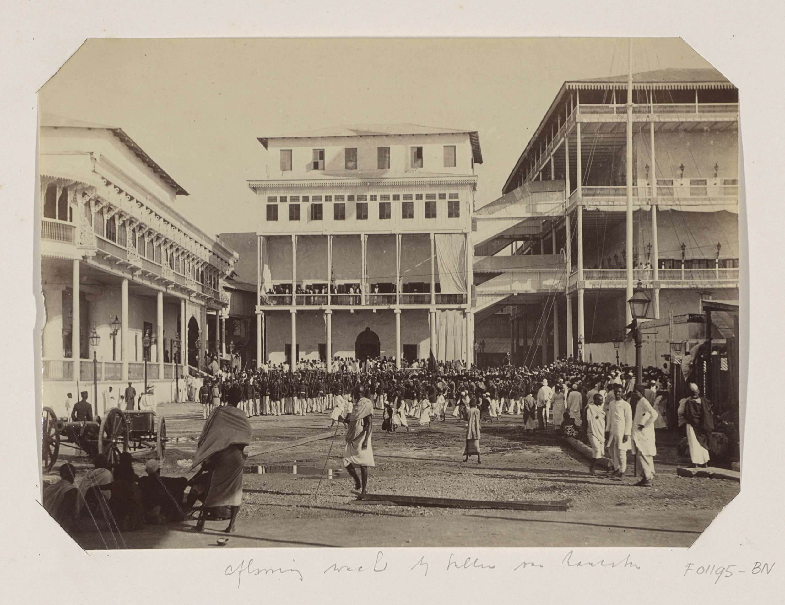 Mensen en militairen bij het paleis van de sultan va...