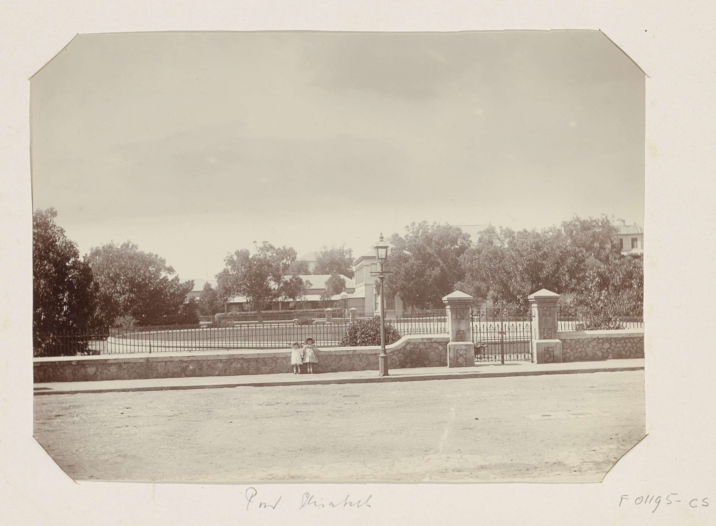 Twee meisjes voor het hek van een gebouw (vermoedeli...