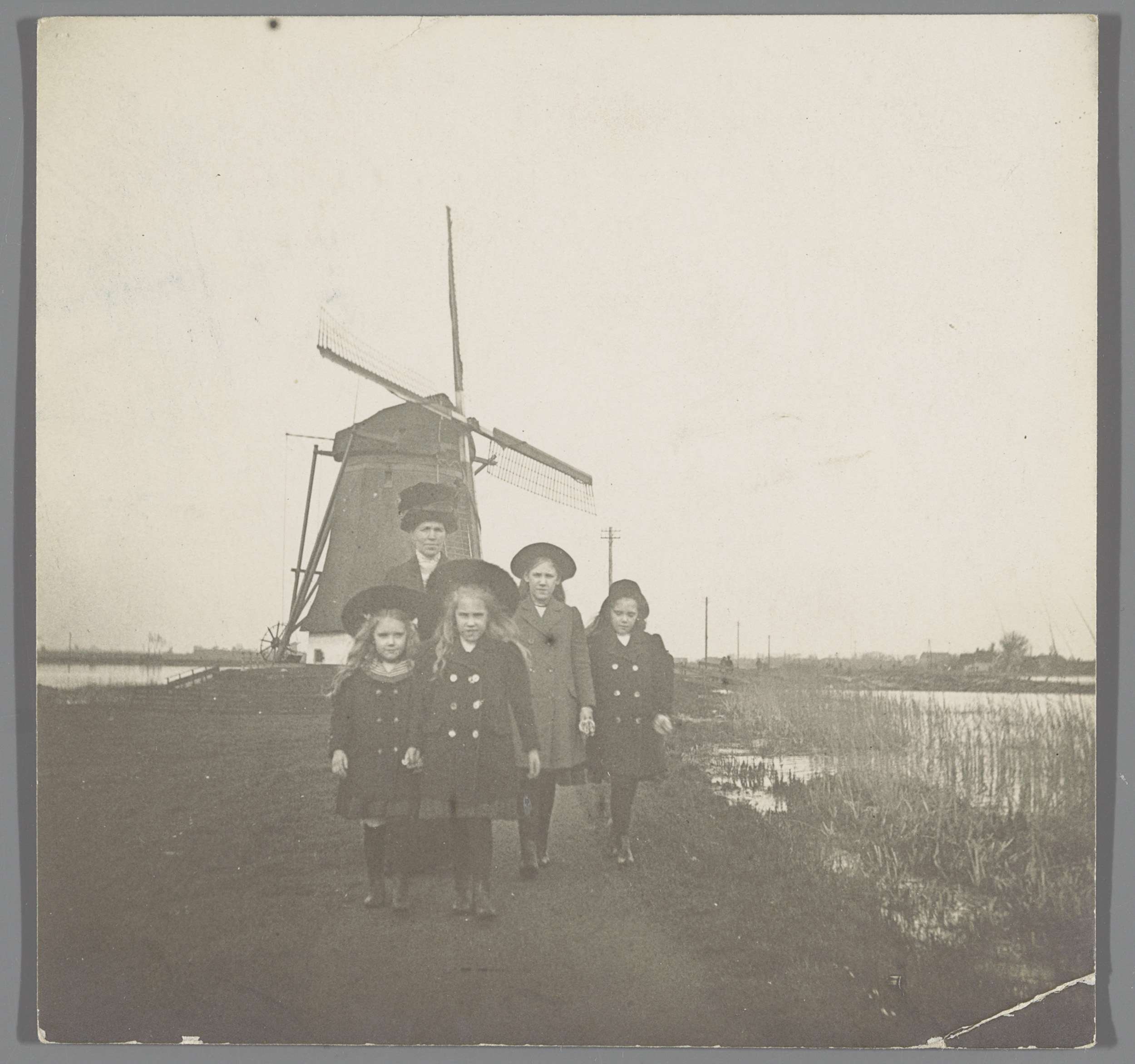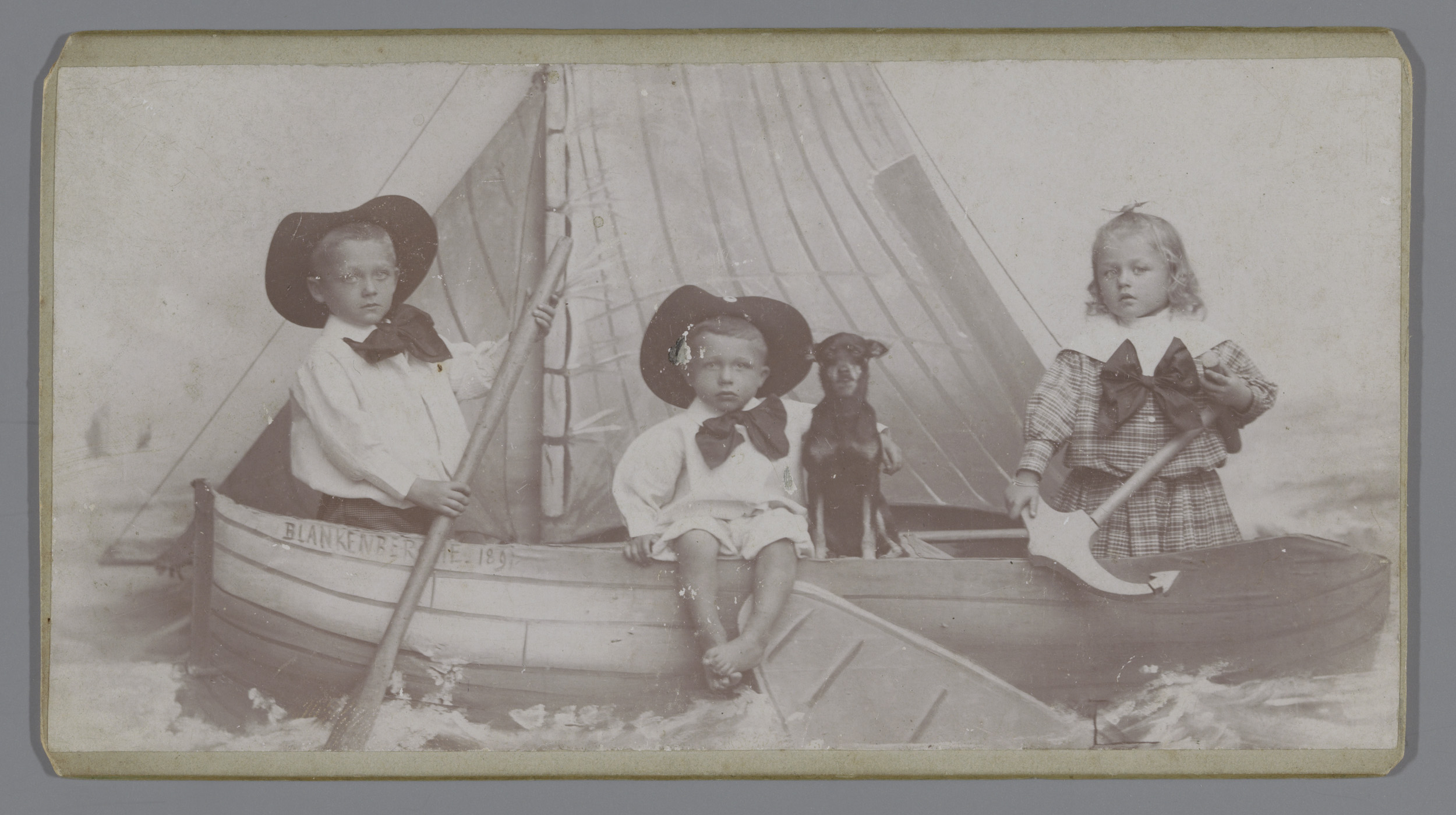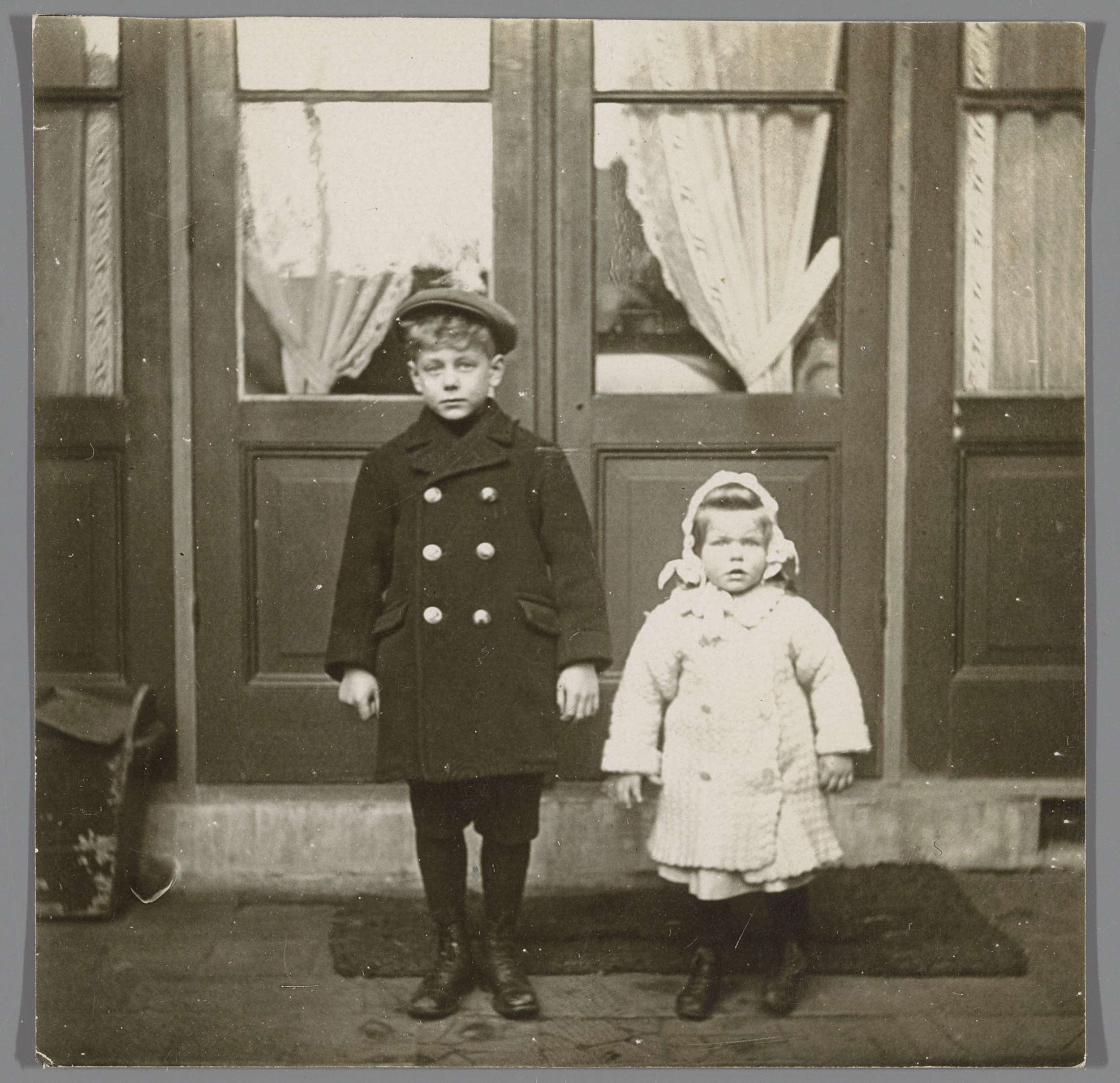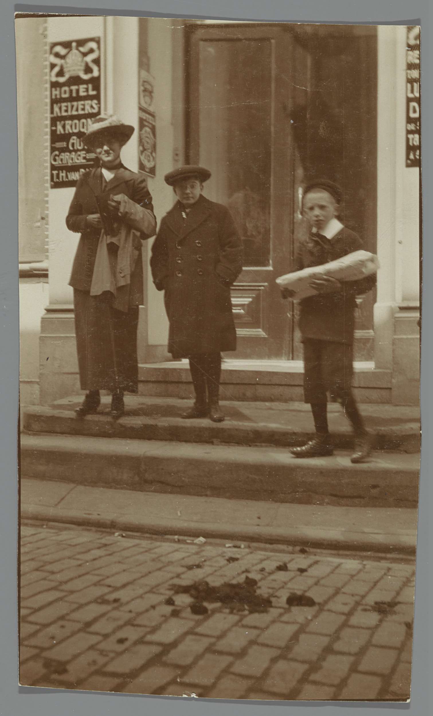 Vrouw met twee jongens op het bordes voor Hotel Keiz...