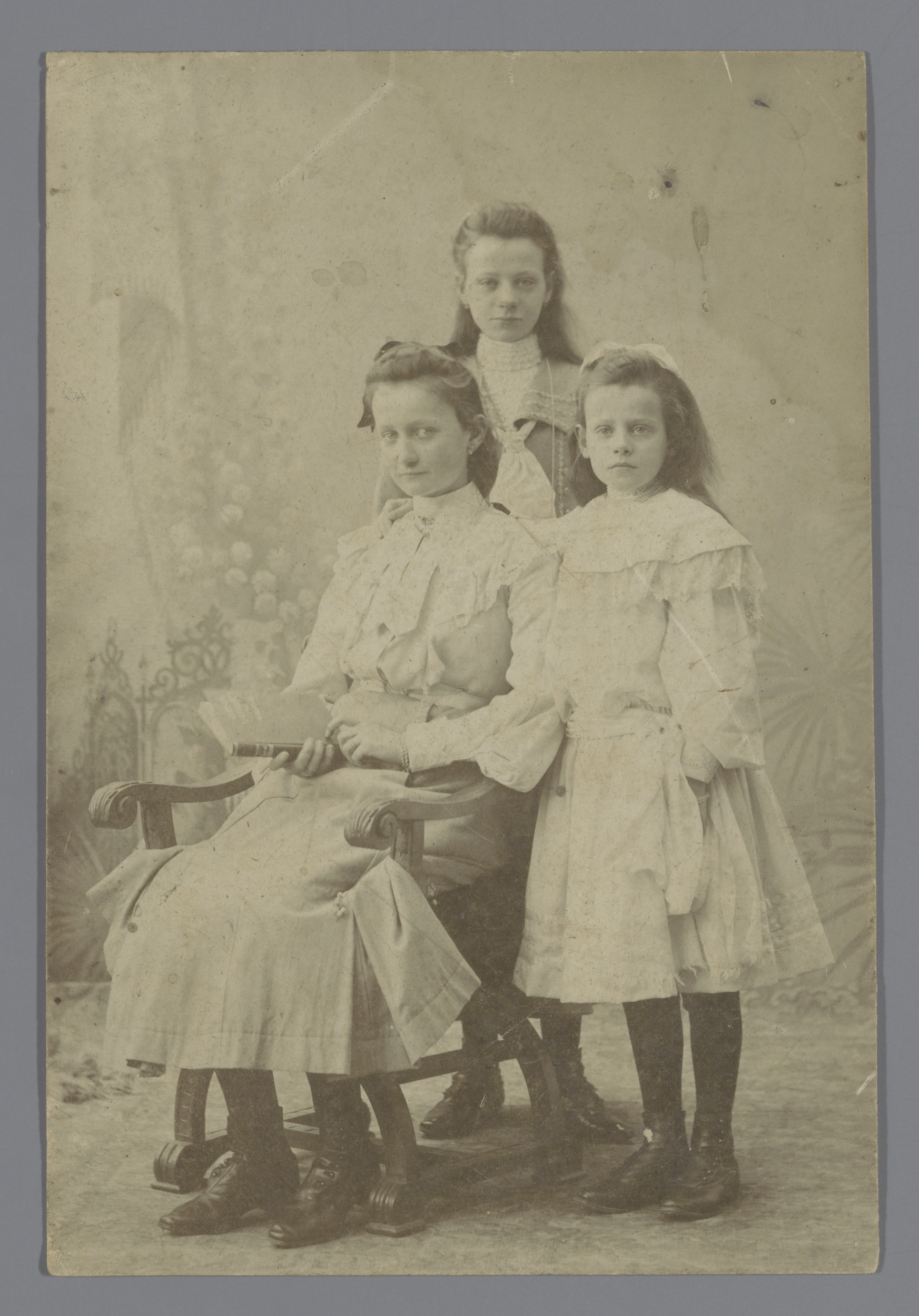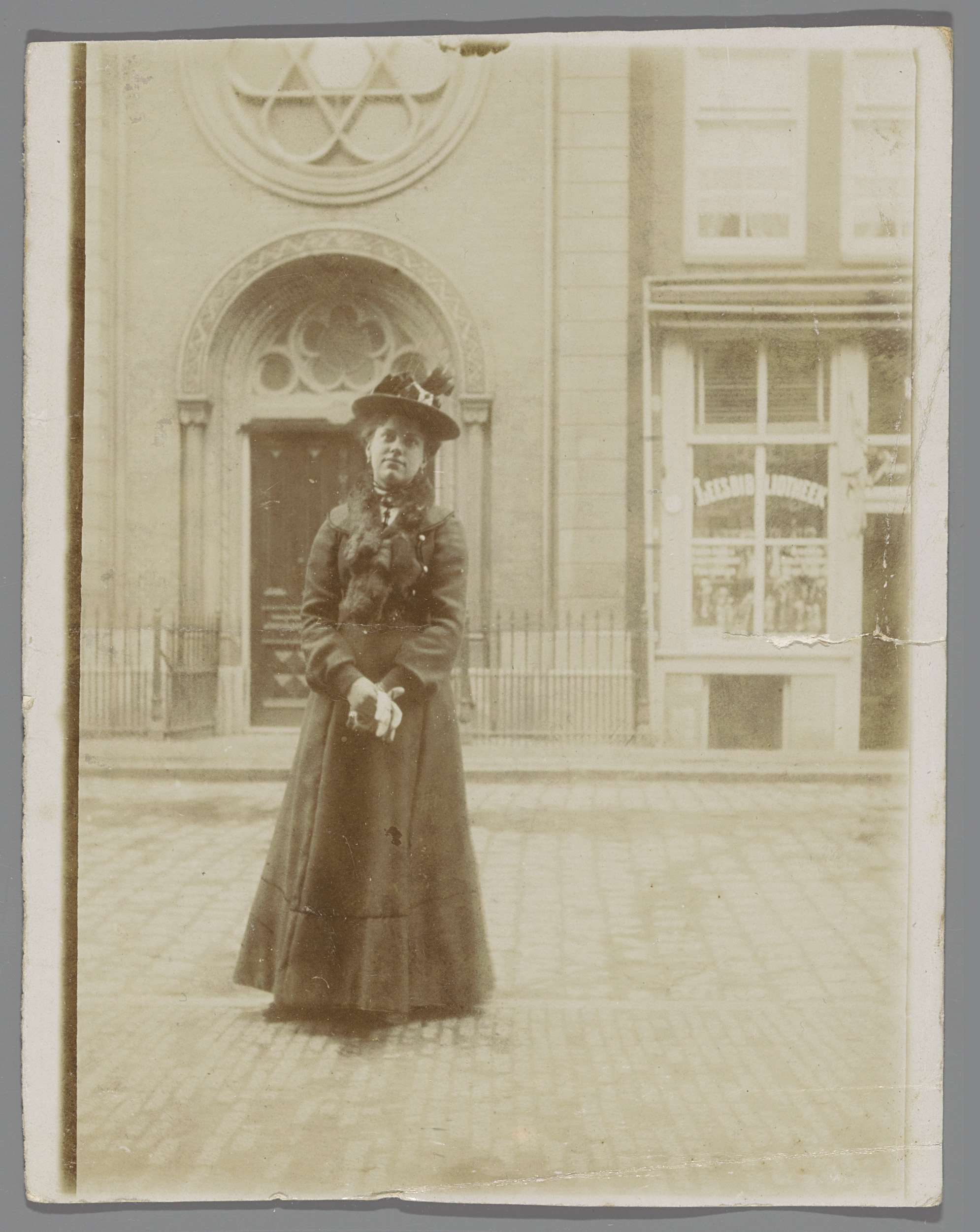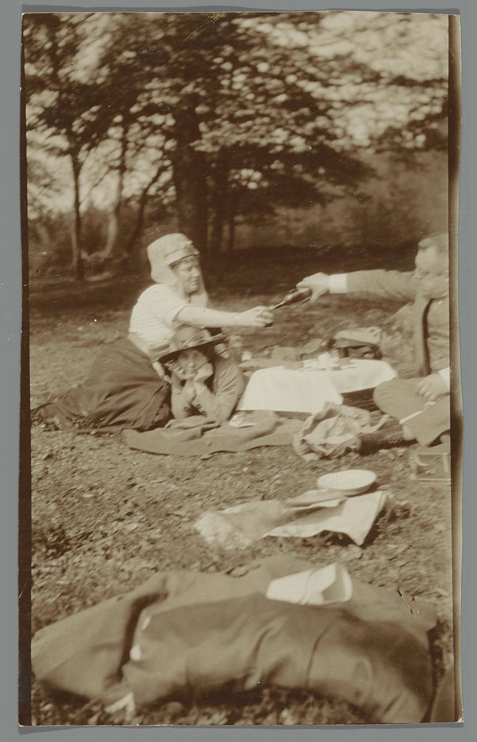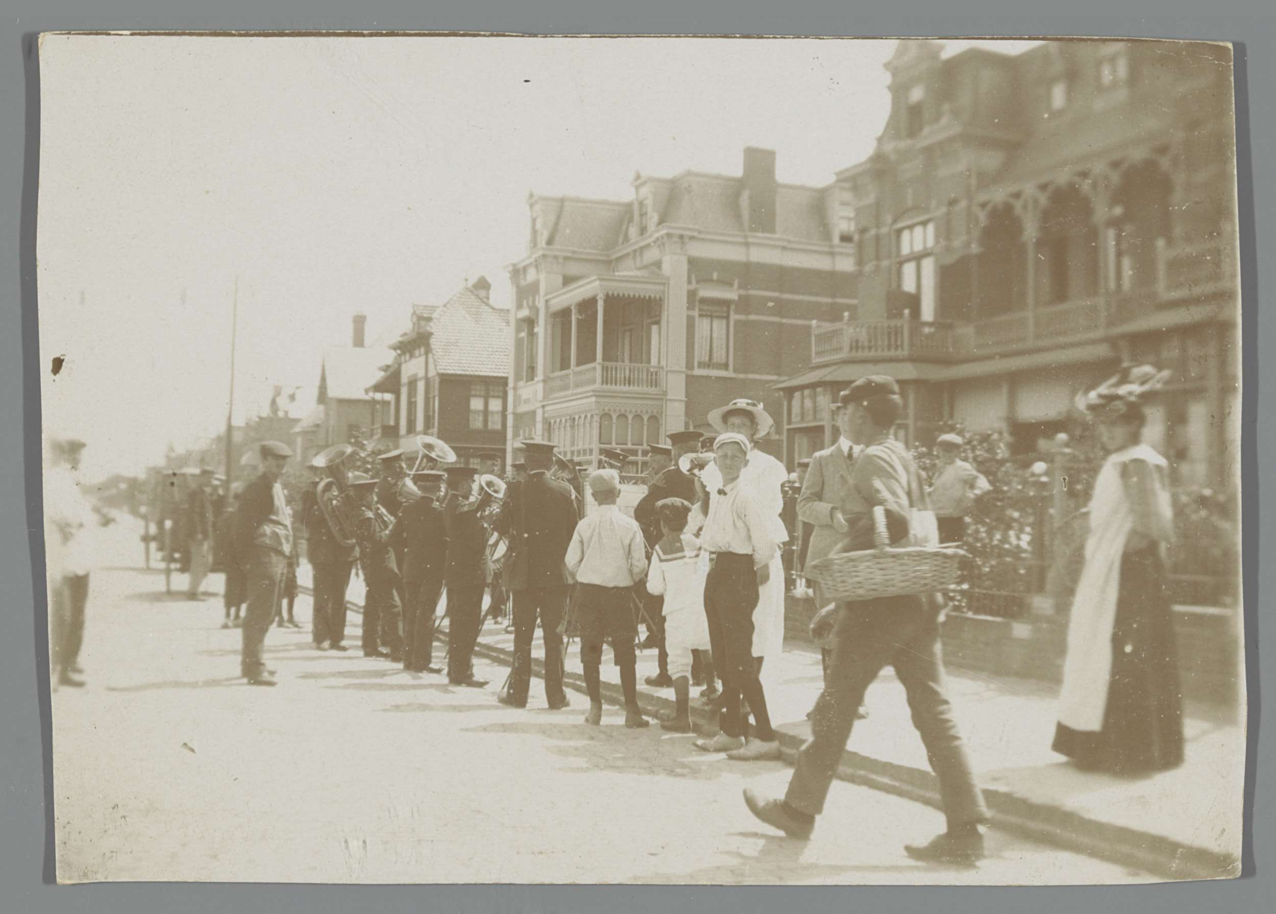 Vrouw met twee jongens op het bordes voor Hotel Keiz...